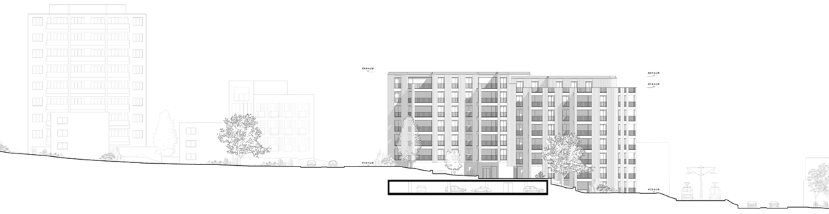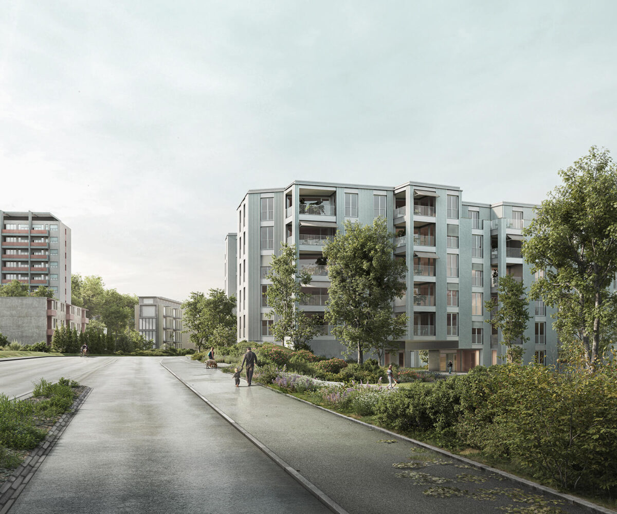 Eine Bebauung entlang der Strasse wird bewusst vermieden. Stattdessen entstehen durch die versetzte Stellung der Baukörper geschützte Freibereiche, visuelle Durchblicke und sanfte Übergänge. Die Höhenstaffelung und Querbezüge stärken die räumliche Durchlässigkeit und fördern die Verbindung mit dem umgebenden Freiraum. Zudem wird durch die gewählte Setzung der bestehenden Lärmbelastung Rechnung getragen. Dies ermöglicht trotz der verkehrsnahen Lage eine qualitative Wohnlage. Die Ausrichtung und Gliederung der Volumen ermöglichen hochwertige Wohnlagen mit direktem Bezug zur Landschaft. Gewerbliche Nutzungen werden zugunsten des Wohnens zurückgenommen, auch vor dem Hintergrund des bereits geplanten und vorhandenen Angebots im näheren Umfeld.