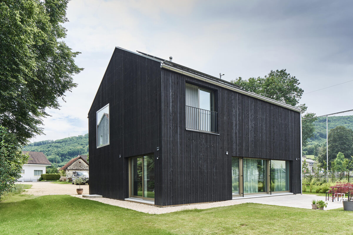 Die grosse Bauparzelle an der Dorfstrasse in Dulliken ist stark durch den ehemaligen Bauernbetrieb geprägt. Etwas willkürlich sind die Bauten um das grosse Bauernhaus angeordnet. So sind Unterstände, Lager, Gartenhaus usw. je nach Notwendigkeit platziert und ergeben eine interessante Komposition von Bauvolumen. Auf genau dieser Idee des «Hineinbauens» basiert das Konzept für das Einfamilienhaus. In seiner äusseren Erscheinung entlehnt sich der Ausdruck dem üblichen Schopftypus. Durch die schwarze Fassade hebt er sich aber gegenüber den ursprünglichen Bauten ab und wird so klar als neu hinzugestelltes Volumen erkennbar.