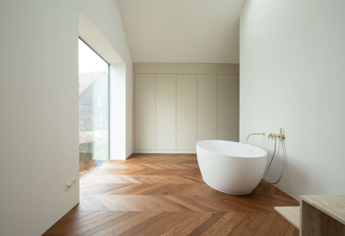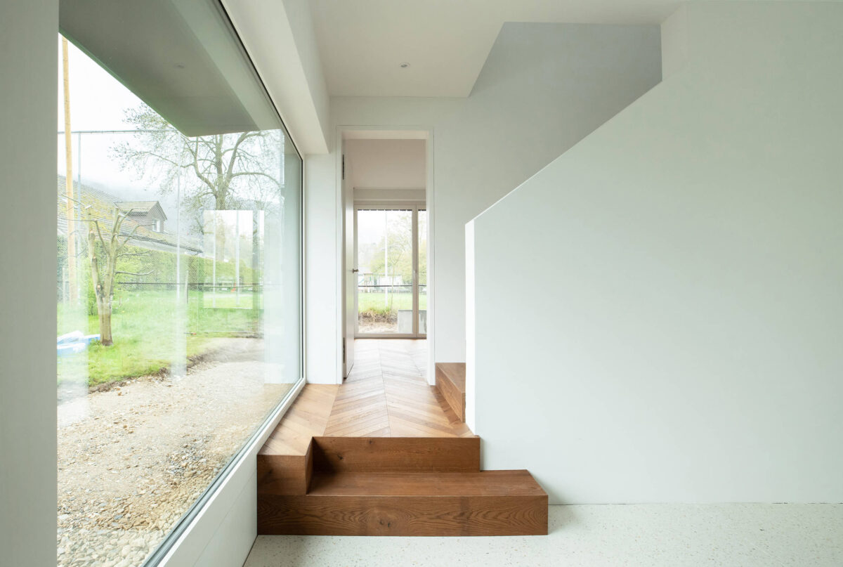 Im Innern gliedern sich die Zimmer und Räume um das zentral positionierte Treppenhaus. Die Räume sind überdurchschnittlich hoch geplant, um das kleine kompakte Volumen im Innern grosszügiger erscheinen zu lassen. Über versetzte Geschosse werden die Räume nach ihrer Funktion entsprechend voneinander abgesetzt.