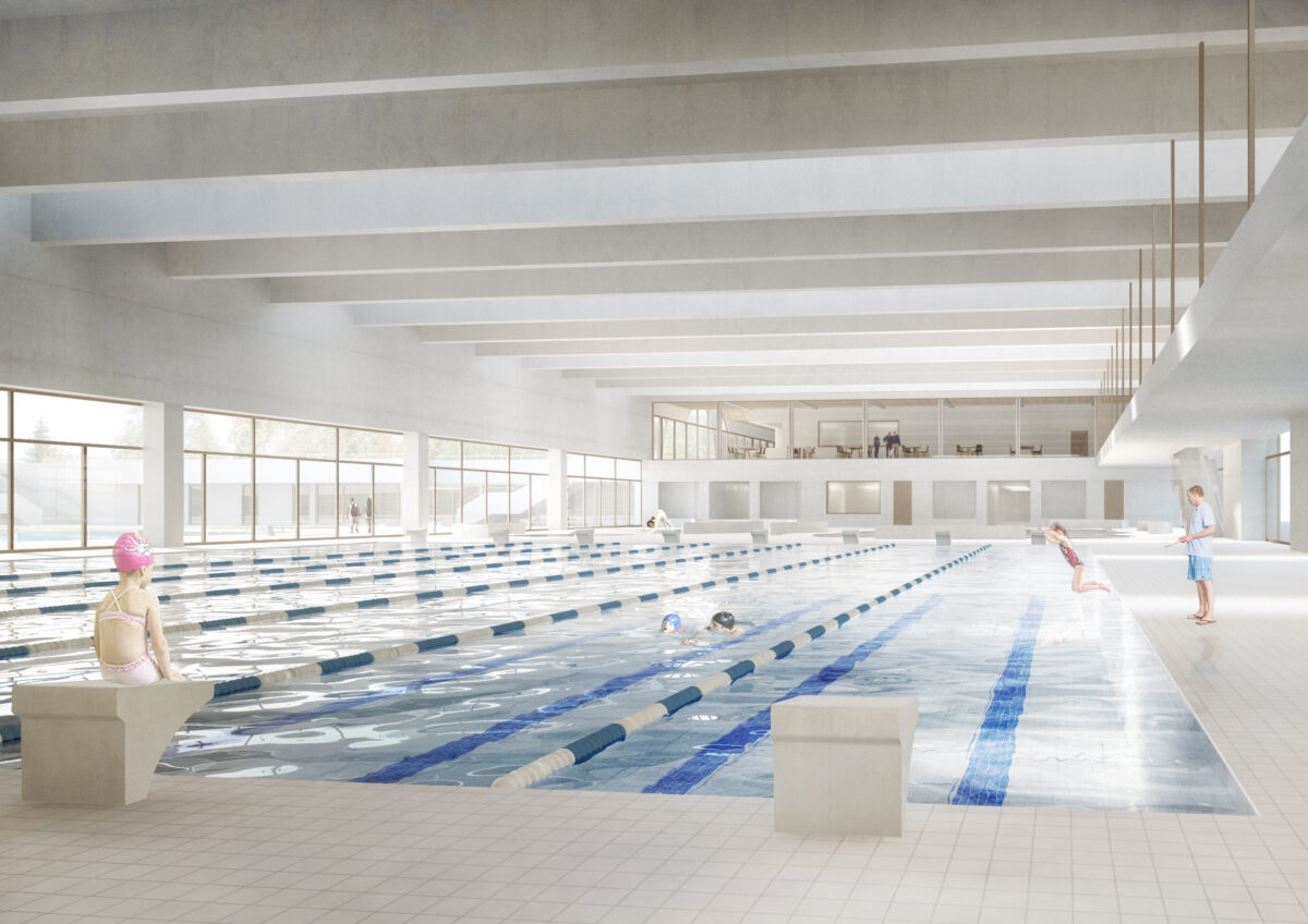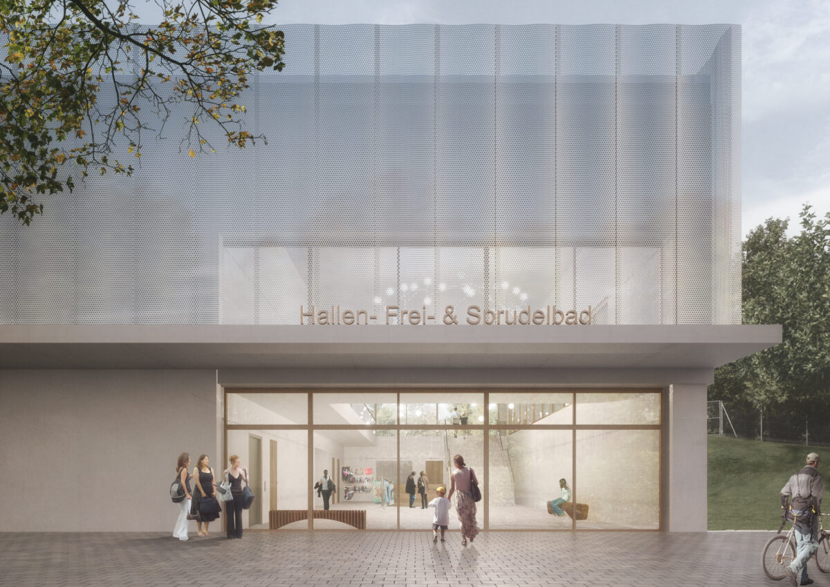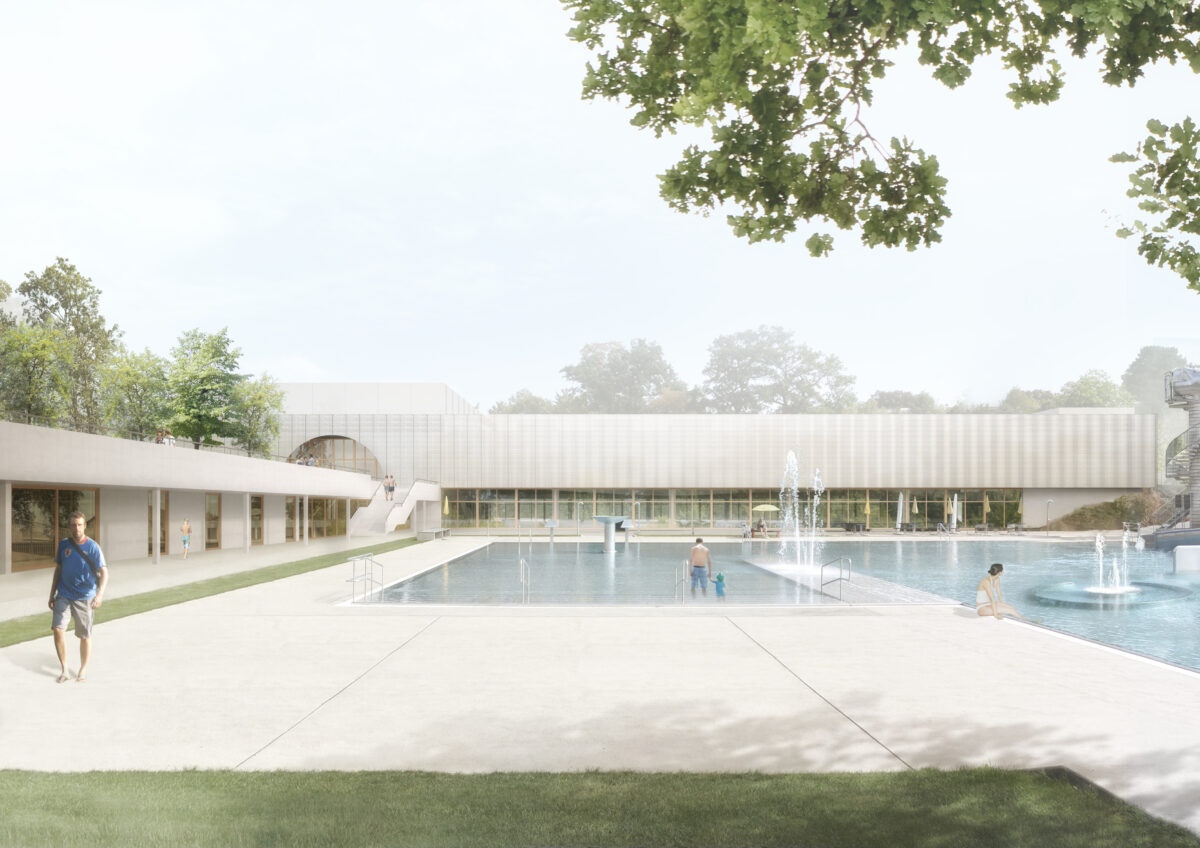 Der Neubau positioniert sich als verbindendes Element zwischen dem Dreieck Vorplatz, den Erlebnisbecken und dem 50m Sportbecken des Freibads.