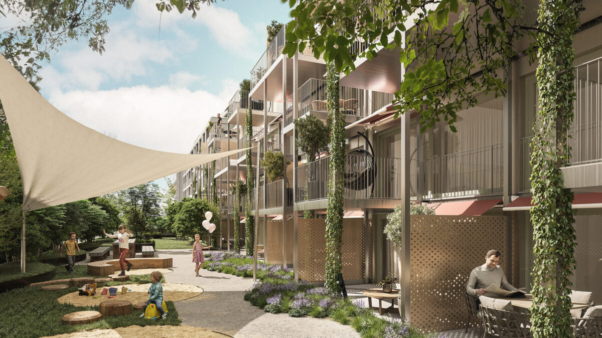 Der Innenhof wird zur Begegnungszone und lädt zum Verweilen ein. Der grosszügige Gemeinschaftsplatz – mittig im Innenhof – ist angrenzend zu Spielbereich und einer grösseren Rasenfläche für kleinere Ballspiele. Die Kulissenbildung mit einheimischen Stauden und Sträucher bilden einen Filter zwischen Gemeinschaftsfläche und privaten Aussenbereichen der Townhouse Wohnungen. Eingestreute Beerensträucher laden zum Naschen ein. Im Sommer wächst dieser Filter in die volle Grösse heran und bleibt über den Winter als Winterschmuck bestehen. Dazu sind drei solitäre Hochstammbäume in Trog schattenbildend auf das Stützenraster der Einstellhalle platziert.
