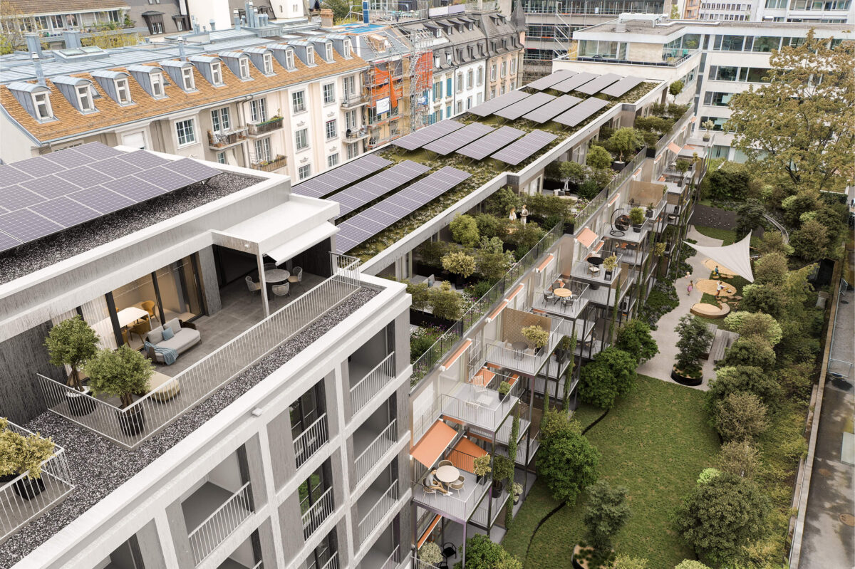Auf den Dächern ist eine extensive Begründung platziert. Die Bepflanzung ist unterhalb der Ständerkonstruktion mit der PV-Anlage durch Sukkulenten, Sedum und Steingartenpflanzen begrünt, welche die Hitzeentwicklung stark aufnehmen und kühlend in die Umgebung wirken. Unterstützend zur Hitzeminderung ist auf dem gesamten Dach eine Retentionsfläche mit einem Wasserleitsystem verlegt, dadurch wird das Wasser zeitlich verzögert und auf die Attikaterrasse geleitet. Das zurückgehaltene Wassers auf den Dächern trägt massgeblich zur Hitzeminderung bei. Die Attikaterrasse ist durchwegs bepflanzt und zeigt.