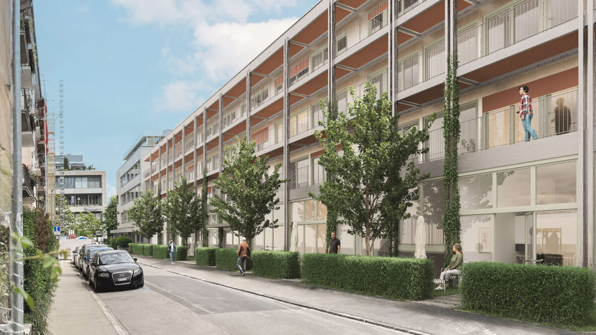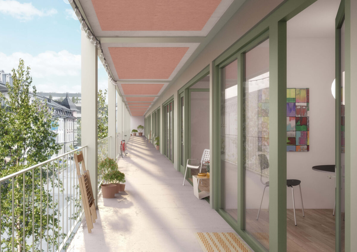 Das Konzept sieht eine klare angedockte Struktur, bestehend aus Laubengangerschliessung und vertikalen Treppenkernen vor, der den Raummodulen zwischen den Schotten in Bezug auf Nutzung und Ausgestaltung sowohl im Grundriss, wie auch in der Fassade grosse Flexibilität ermöglicht.