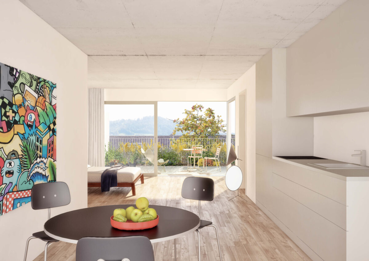 Durch die Entkernung des Bestandes kann auch die bestehende Tragstruktur in der neuen Raumorganisation aufgegriffen und weitergestrickt werden. Die Wohnungen sind allesamt in Schotten unterteilt, wobei die Schotten von Norden nach Süden verlaufen. Die unterschiedlichen Schottenabstände sorgen für unterschiedliche Wohnungsgrössen. Ebenfalls lässt sich durch die Schotten der Wohnungsmix steuern, indem die Schotten wahlweise den Wohnungen ganz oder teilweise zugeschlagen werden können. Die Wohnungen an sich sind jeweils mittig durch eine Nasszelle/Reduit-Zone in Wohnen/Schlafen sowie Kochen/Essen unterteilt. Die mittige Zone sorgt für einen zusätzlichen Filter, welcher die Privatsphäre auf der Südseite erhöht. Dazu werden in diesem Bereich die kompletten haustechnischen Erschliessungen untergebracht und nach Norden und Süden verteilt. Dies sorgt für eine effiziente Erschliessung der Wohnungen mit sämtlichen Medien.