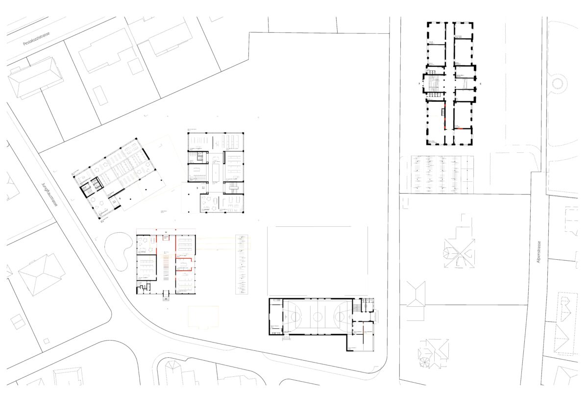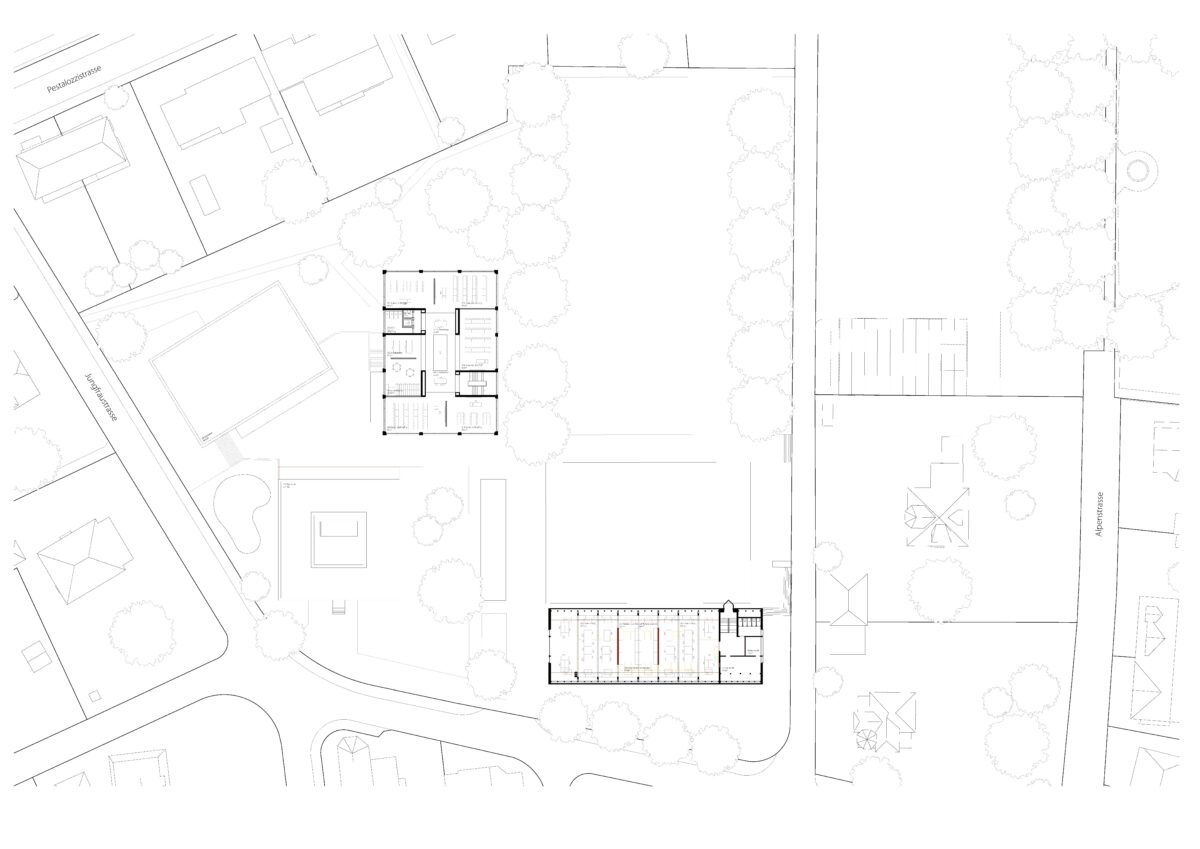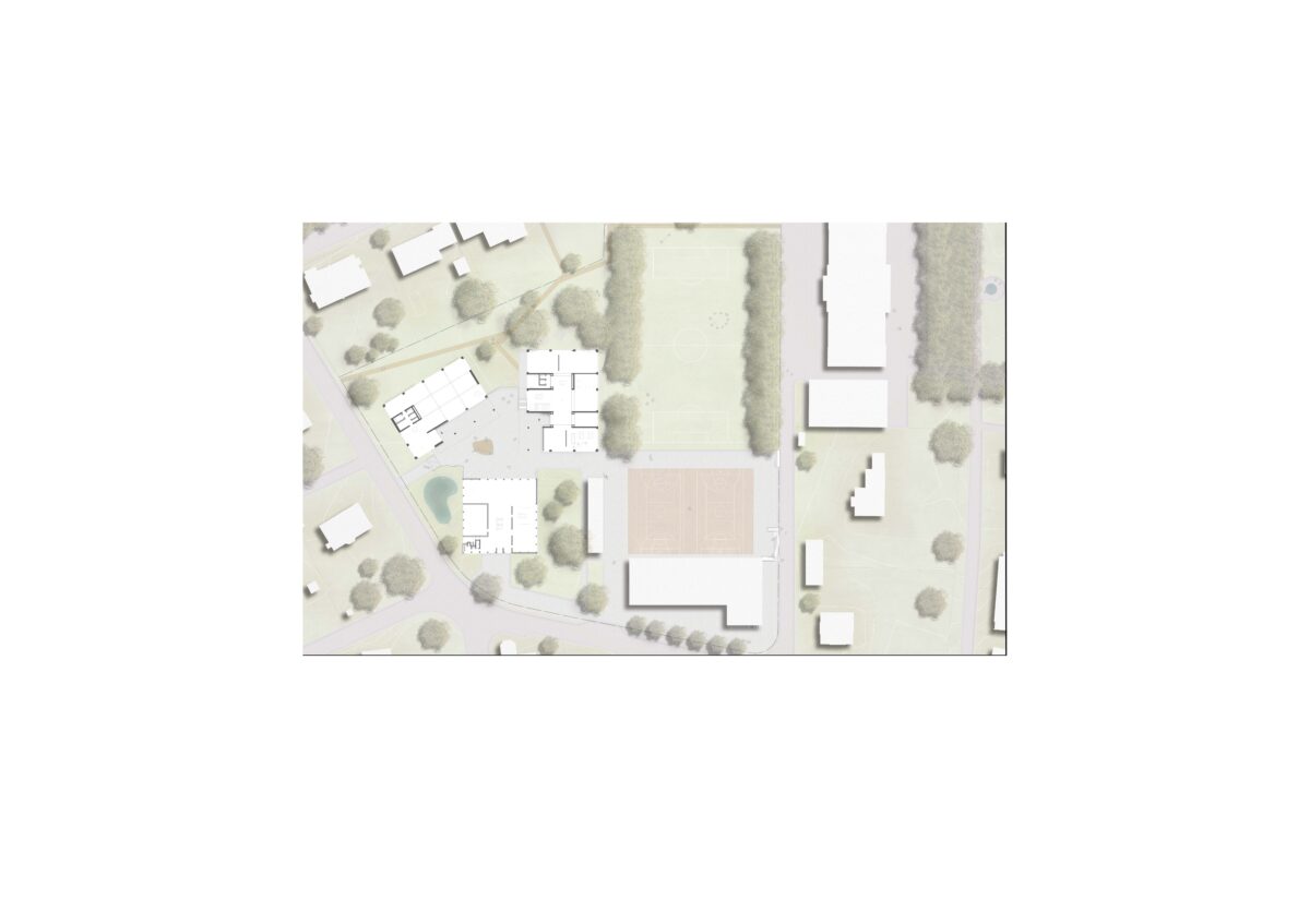 Die Verteilung des Raumprogramms auf drei Volumen sorgt für kleinteilige, der Umgebung angepasste Proportion und eine stimmige Setzung. Die zwei neuen, in ihrer Massstäblichkeit an den Bestand angeglichenen Volumen nehmen sich in ihrer Formensprache zurück. Der Fokus liegt nicht auf den einzelnen Gebäuden, sondern auf der funktionalen Einheit der drei Schulbauten, wobei das bestehende selbstverständlich integriert wird. Durch die kleinteilig gewählte Struktur integriert sich das Trio elegant in die umliegende, kleinkörnige Quartierstruktur, vermag aber auch seine neue Funktion als zweiter Hub im Bildungscampus gegenüber dem Hauptgebäude zu behaupten. Durch die Setzung und die Abdrehung der Mediathek und der Situierung des Unterrichtstraktes vermittelt der neue Standort zwischen der Bebauungsstruktur des Quartiers und der Bebauungsstruktur des Gymnasiumareals. Die Ausrichtung reagiert so auf die beiden quartierstrukturbildenden Hangkanten und vermittelt zwischen diesen.