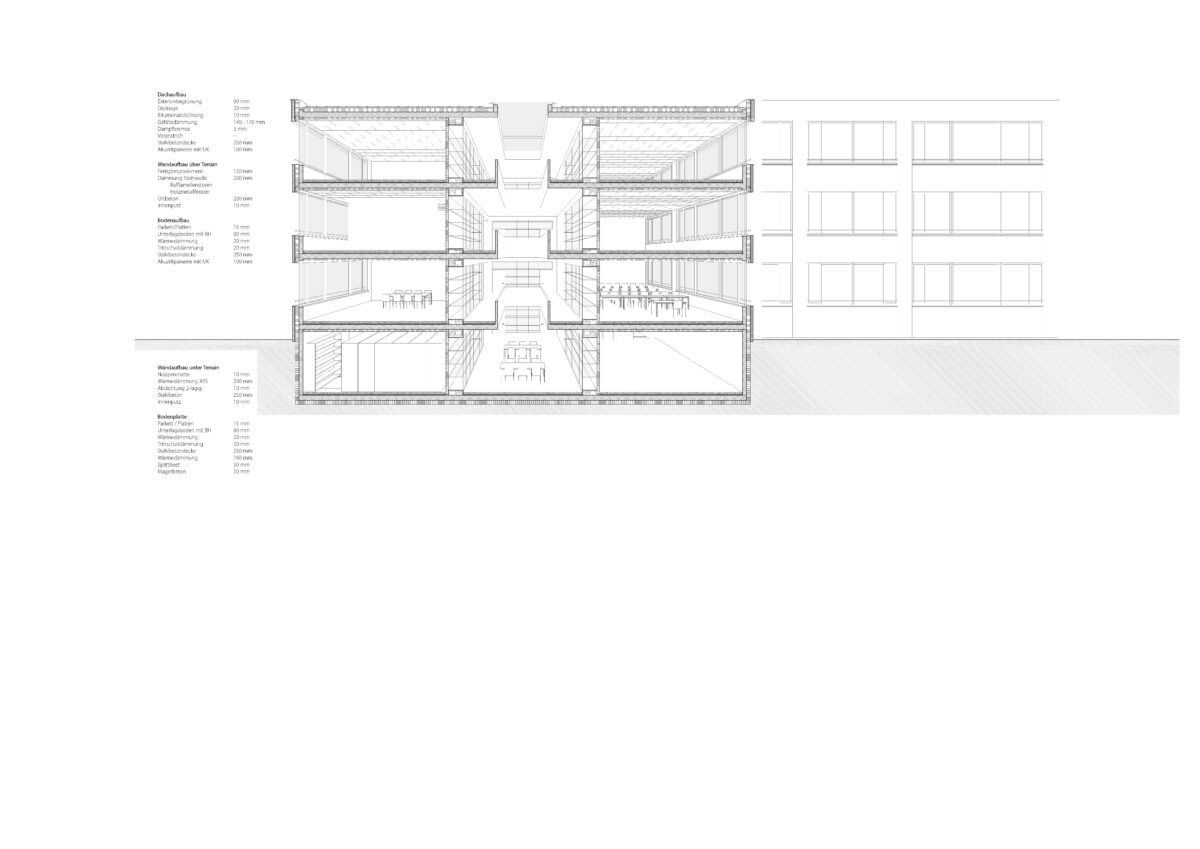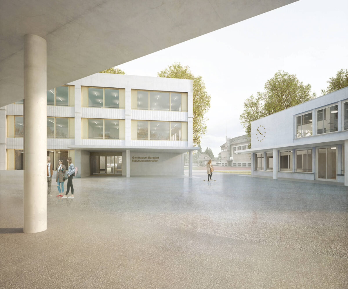 Die räumliche Erweiterung des Gymnasiums Burgdorf wird nördlich des erhaltenswerten Ergänzungsgebäudes durch zwei neue Baukörper umgesetzt. Die beiden neuen Volumen erweitern das Ergänzungsgebäude zu einer funktionalen Einheit und spannen in der Mitte einen Platz auf. Dieser Platz wird zum neuen Erschliessungs- und Begegnungsraum des westlichen Campusareals. Er schafft Sichtbezüge und Wegverbindungen zwischen der bestehenden Turnhalle und des klassizistischen Hauptgebäudes. Der Platz bildet den Knotenpunkt zahlreicher formeller und informeller Verbindungswege: Er ist über den befestigten Sportplatz mit dem Hauptgebäude verbunden, dient als direkter Zugang für die Schülerströme vom Bahnhof Steinhof und vom Hauptbahnhof und bietet zudem eine ehe versteckte Verbindung zum Gymheim.