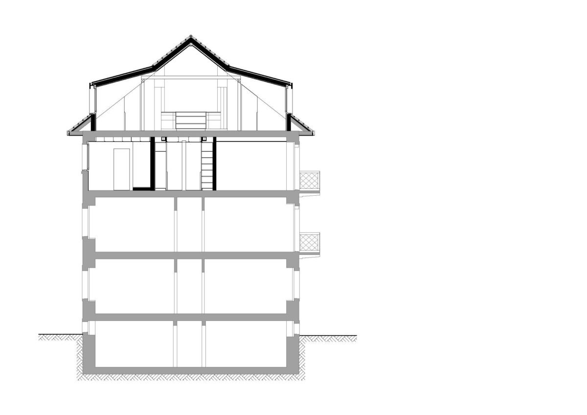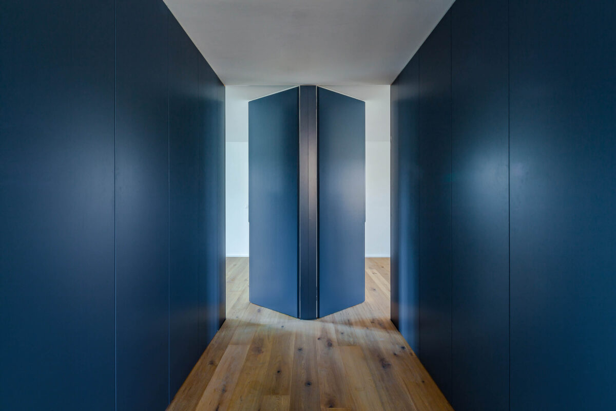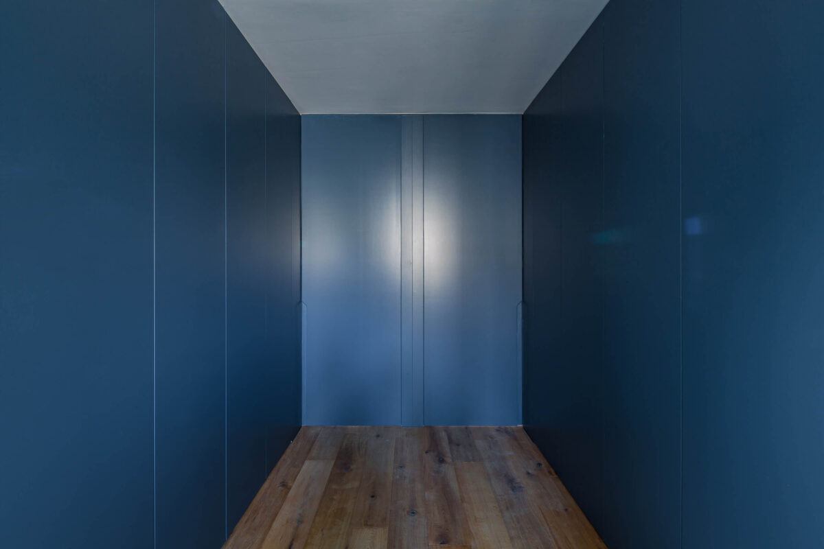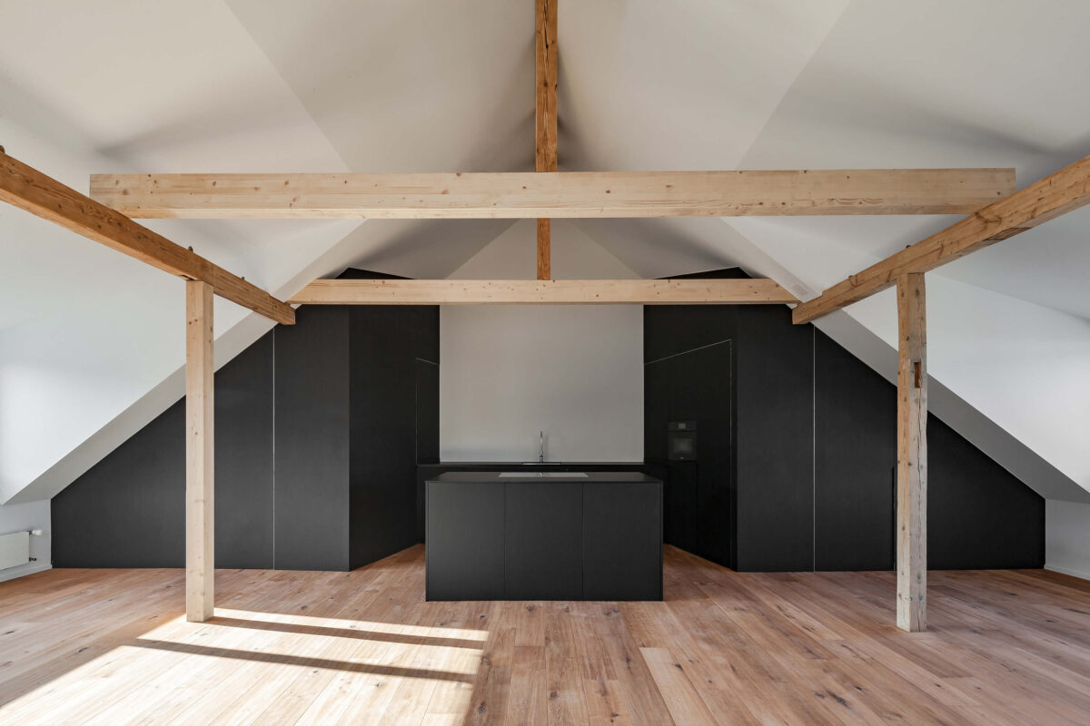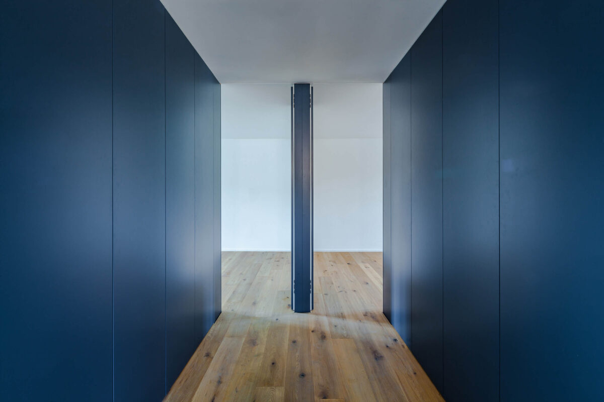 Im Gebäudeinnern wurden die beiden obersten Stockwerke komplett entkernt und saniert. Die Raum-durch-Raum-Erschliessung wurde aufgehoben, um die Wohnung familiengerecht zu gestalten. Zu diesem Zweck wurde zentral im Schlafgeschoss ein Vestibül integriert, das als Ankleide dient und den Zugang zu allen Räumen gewährt. Das Vestibül wird entmaterialisiert und mit einer matten Farbe innenwändig durchgängig gestrichen. Die Fronten nehmen sowohl Schranktüren wie auch Zimmertüren auf, wobei sich letztere nur durch die eigens entworfenen Grifffräsungen von den Schrankfronten subtil differenzieren und so dezent die Zugänge markieren. Im Obergeschoss wurde das komplette Dachgeschoss zu Wohn- und Esszwecken freigespielt. Durch die grosszügigen Lukarnen kann das Dachgeschoss maximal natürlich belichtet werden. Die Abmessungen unterstreichen die Grosszügigkeit des einstigen Estrichs. An der Rückwand nimmt eine als Paravent gefaltete Wand die subsidiären Funktionen Küche, Reduit und WC auf und setzt sich farblich ab.