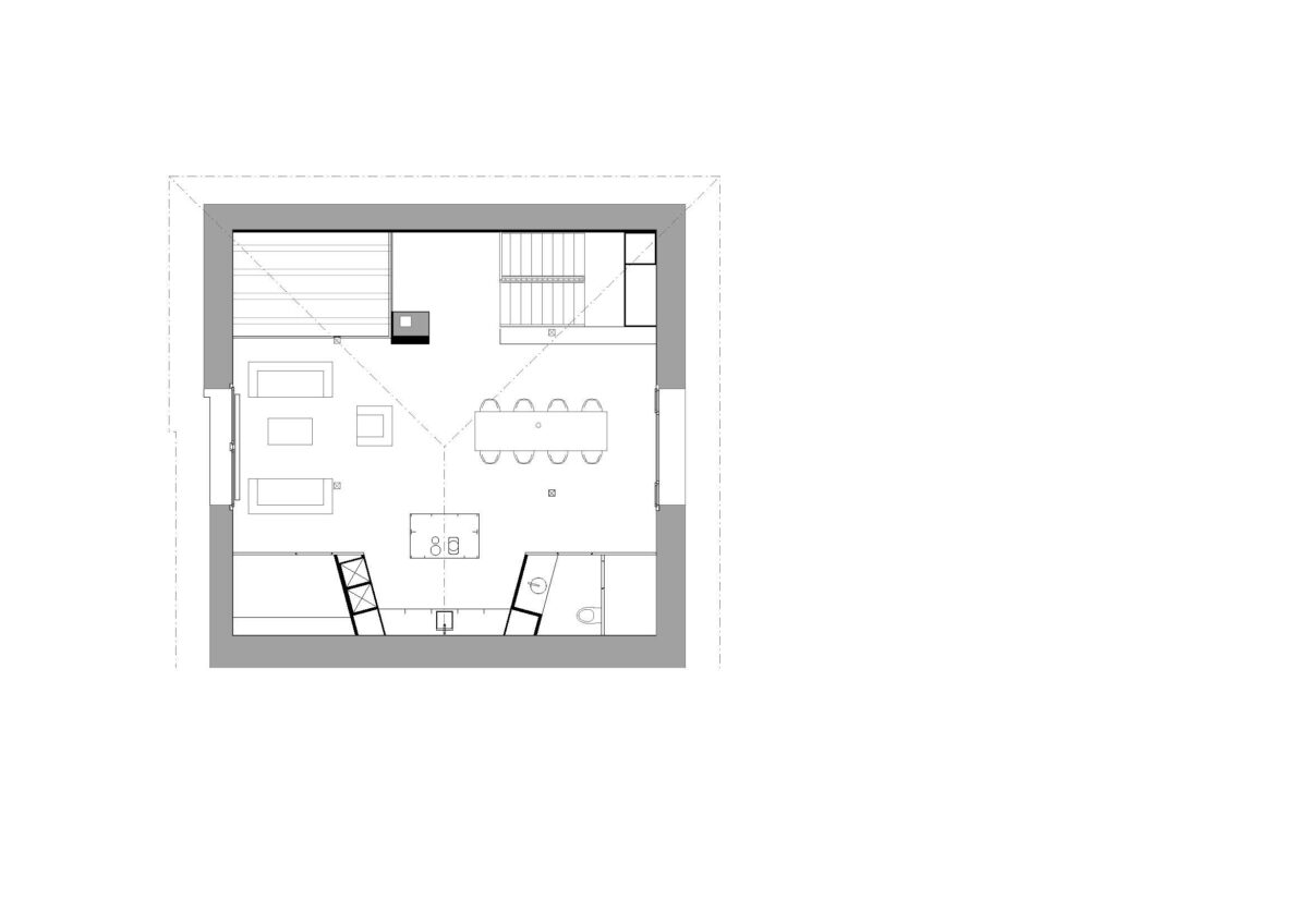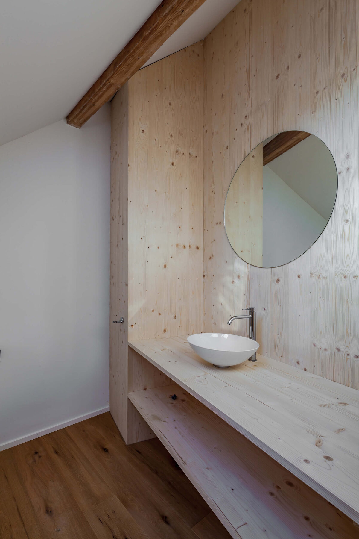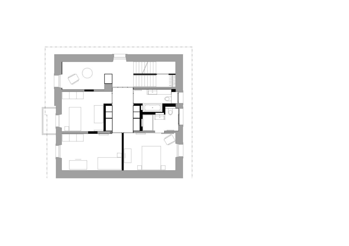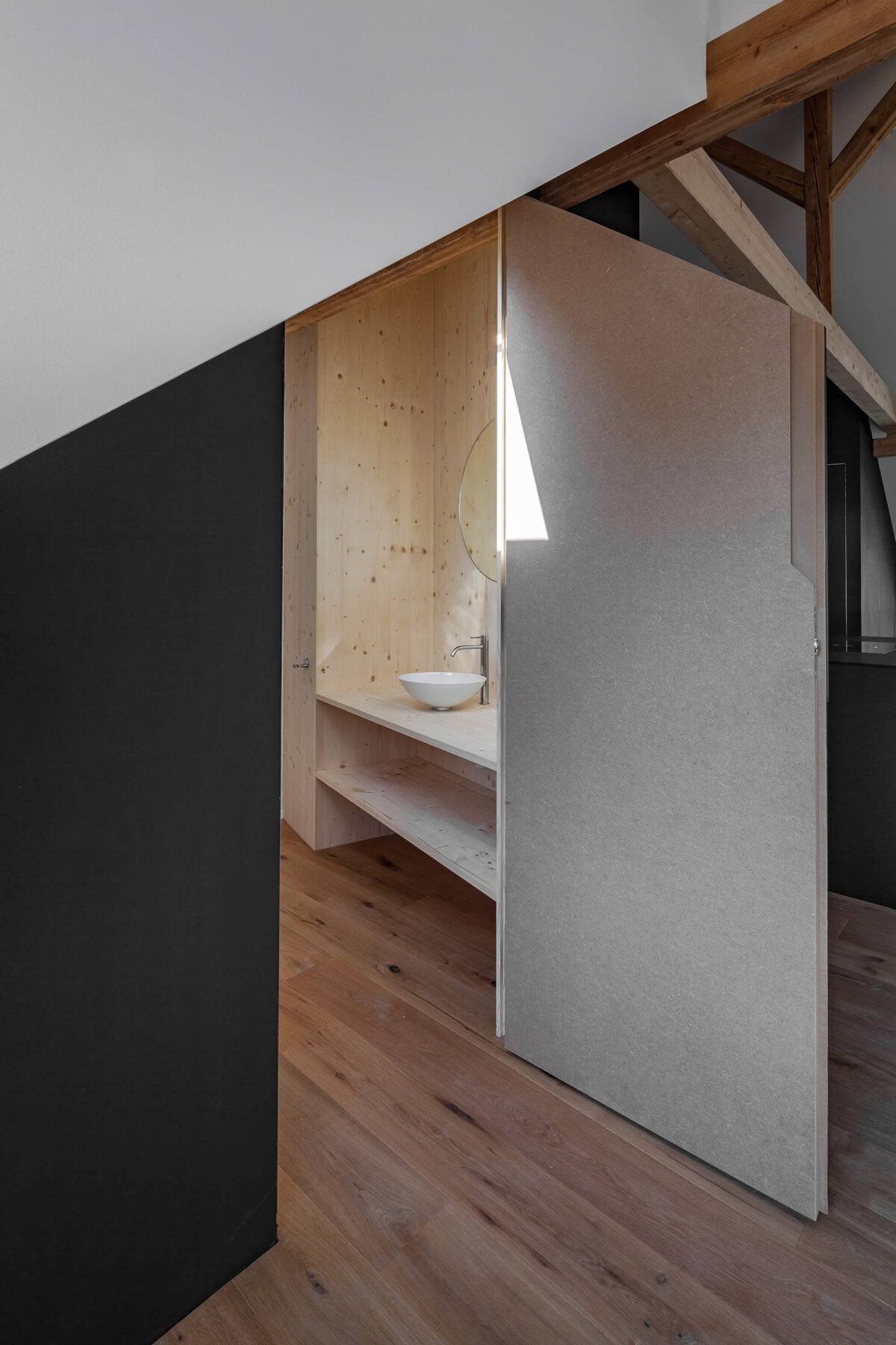Im Gebäudeinnern wurden die beiden obersten Stockwerke komplett entkernt und saniert. Die Raum-durch-Raum-Erschliessung wurde aufgehoben, um die Wohnung familiengerecht zu gestalten. Zu diesem Zweck wurde zentral im Schlafgeschoss ein Vestibül integriert, das als Ankleide dient und den Zugang zu allen Räumen gewährt. Das Vestibül wird entmaterialisiert und mit einer matten Farbe innenwändig durchgängig gestrichen. Die Fronten nehmen sowohl Schranktüren wie auch Zimmertüren auf, wobei sich letztere nur durch die eigens entworfenen Grifffräsungen von den Schrankfronten subtil differenzieren und so dezent die Zugänge markieren. Im Obergeschoss wurde das komplette Dachgeschoss zu Wohn- und Esszwecken freigespielt. Durch die grosszügigen Lukarnen kann das Dachgeschoss maximal natürlich belichtet werden. Die Abmessungen unterstreichen die Grosszügigkeit des einstigen Estrichs. An der Rückwand nimmt eine als Paravent gefaltete Wand die subsidiären Funktionen Küche, Reduit und WC auf und setzt sich farblich ab.