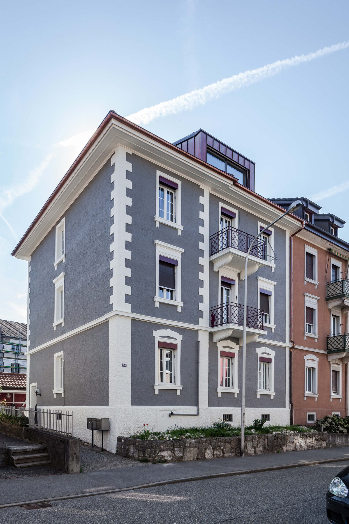 Das Doppelhaus ist Teil eines Mehrfamilienhausquartiers mit typologisch ähnlichen Bauten, deren Hauptcharakteristik die farbliche Absetzung der Gebäudehälften ist. Die neoklassizistischen Fassadenelemente wie Eckrisalite, Kreuzstöcke an den Fenstern und das Gesims über dem Sockelgeschoss sind ebenfalls typisch für die örtliche Bausubstanz. Diese quartierspezifischen Eigenschaften wurden ins Projekt übernommen und über den Kontrast von Hauptfassade und additiven Elementen verstärkt.