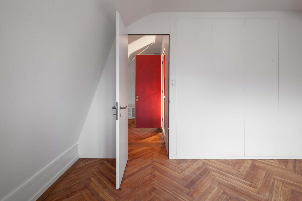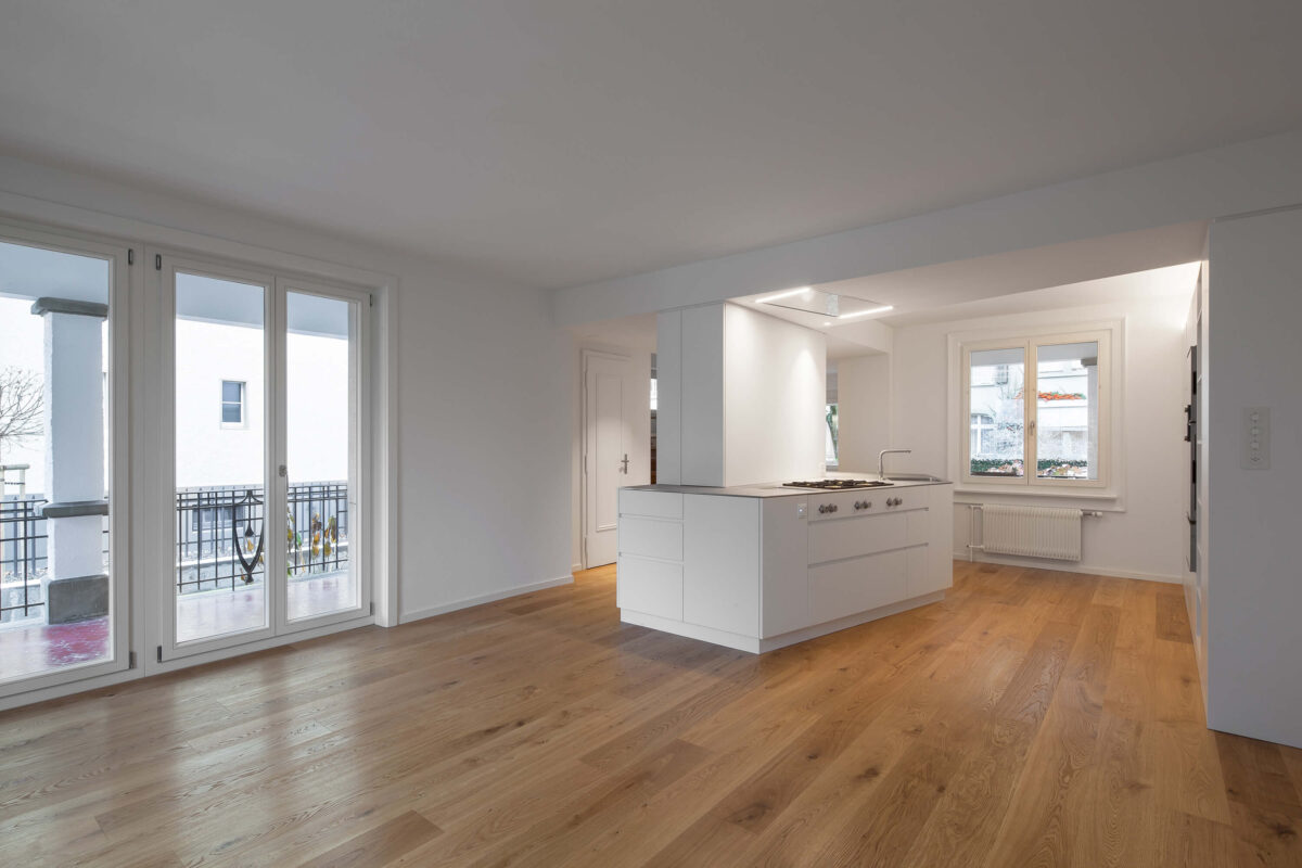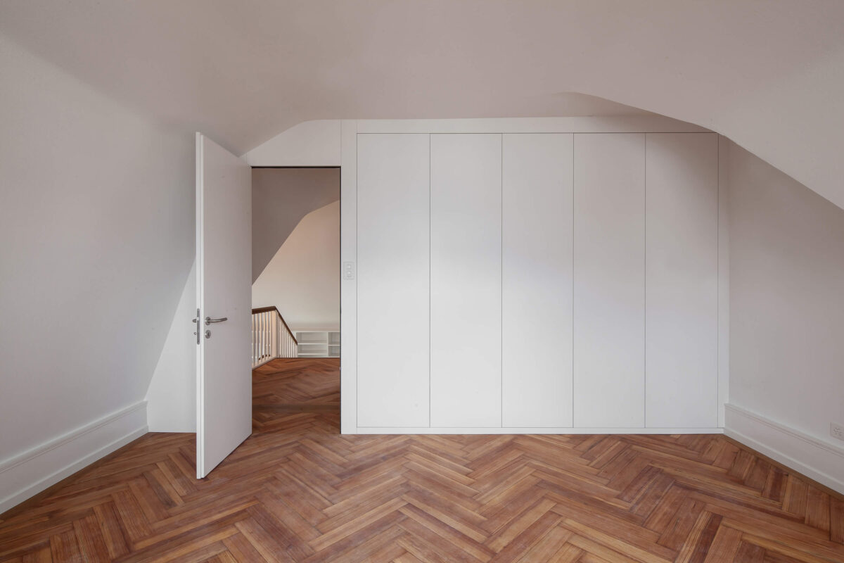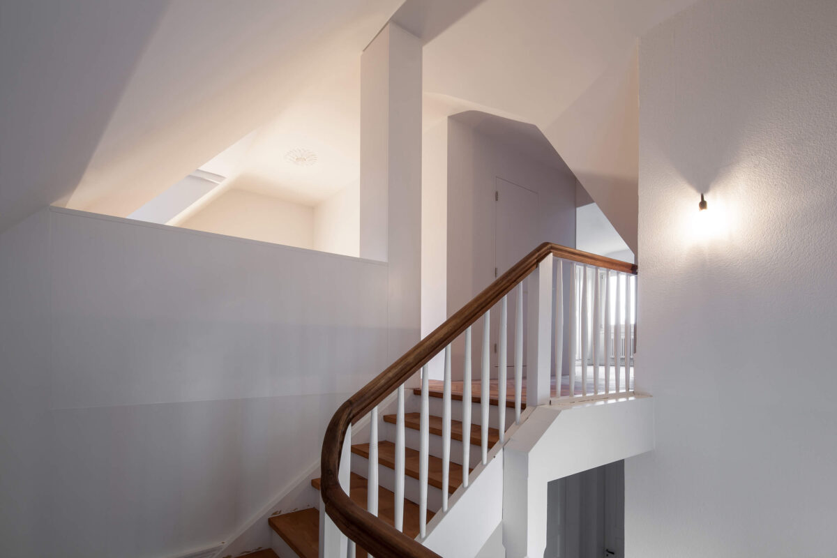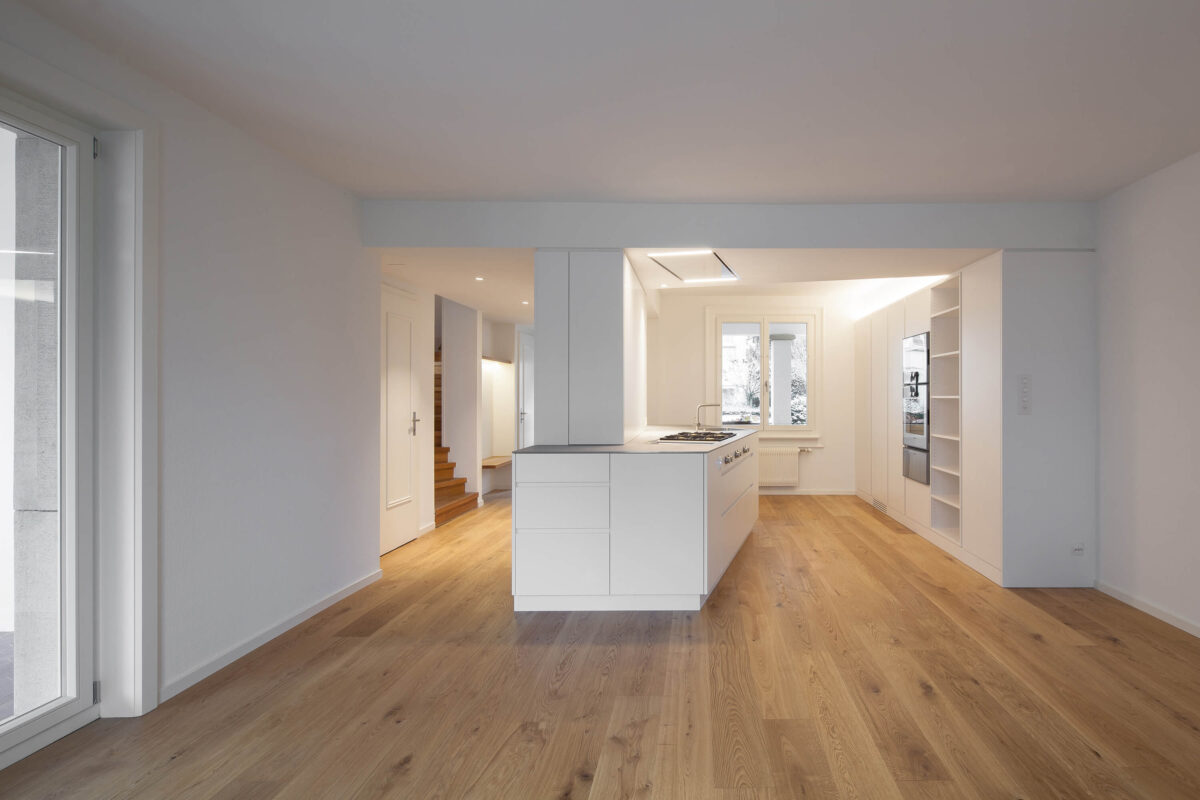 Das denkmalgeschützte Reiheneinfamilienhaus im Liebeggquartier in Bern, wurde in Zusammenarbeit mit der kantonalen Denkmalpflege einer sanften Sanierung unterzogen. Die Küche im Erdgeschoss wurde zum Esszimmer hin geöffnet und zur Wohnküche ausgebaut. Ein Deckenversatz zeugt von der ursprünglichen Raumaufteilung. Durch das leichte Einschieben des Küchenkörpers in den Essbereich werden die beiden Räume funktional verbunden und ergänzen sich zu einem Ganzen. Im Dachgeschoss wurde durch das Einfügen eines „Duschenmöbels“ die Raumaufteilung neu organisiert. Die zusätzlich eingefügte Schicht, trennt nun das Lesezimmer und das Treppenhaus vom privaten Schlafzimmer.