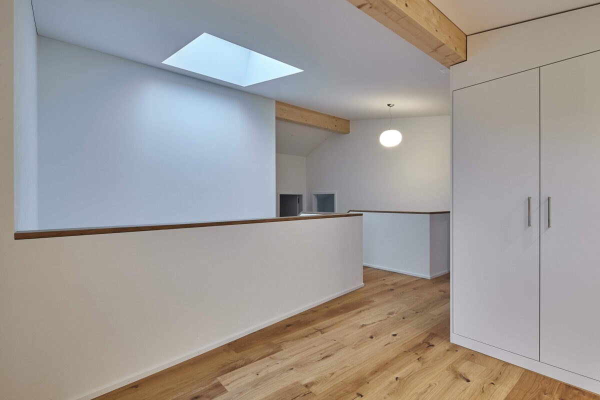 Das zentral angeordnete Treppenhaus verbindet die in ihrer Funktion entsprechend platzierten Räume physisch miteinander, wobei die Räume in ihrer Privatsphäre von unten nach oben zunehmen. In der Gebäudemitte sorgt eine grosse, lichtdurchflutete mehrgeschossige Galerie für spannende Sichtbezüge der verschiedenen Levels und macht die Wohnung dadurch sehr grosszügig.