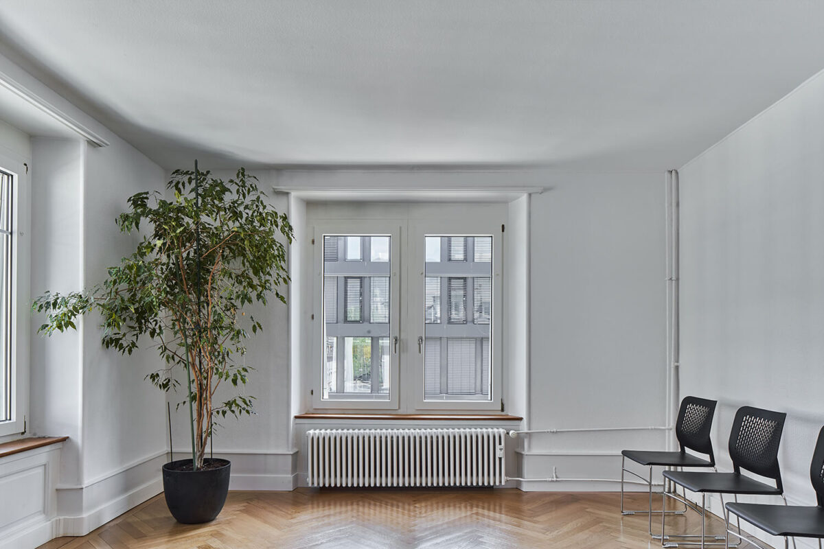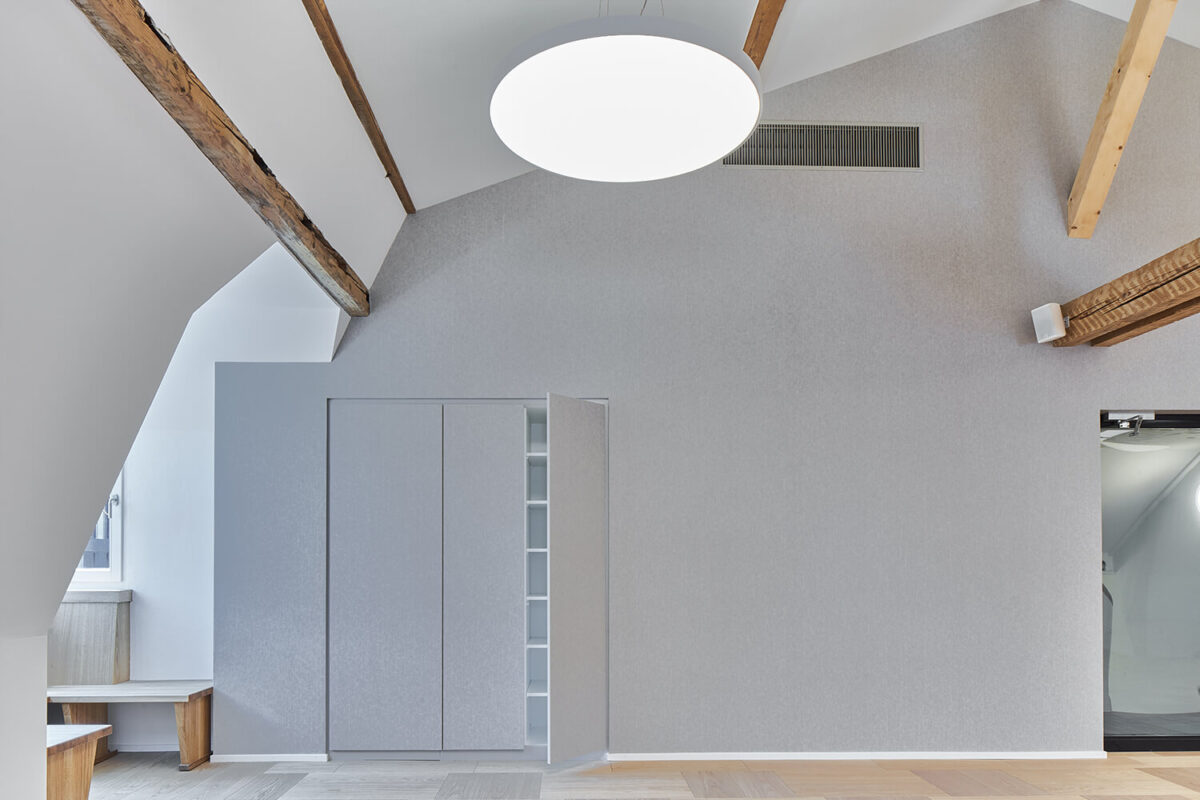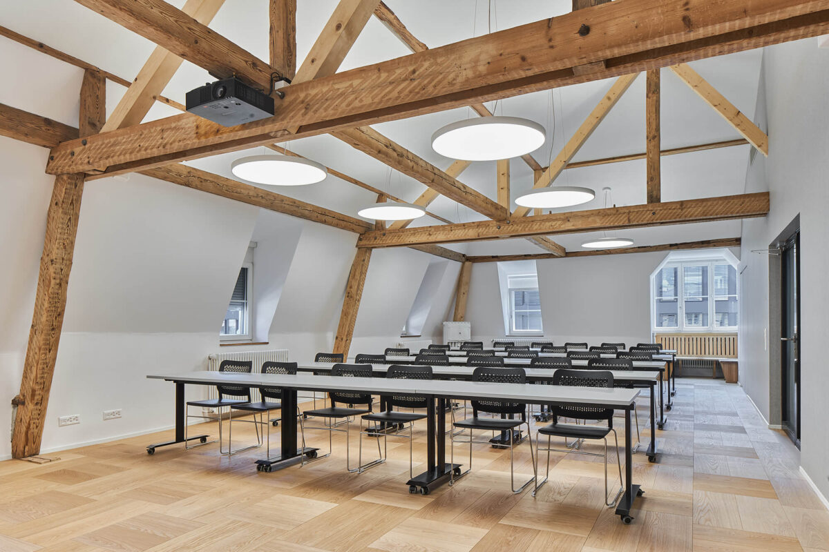 Der Hauptsitz der Lungenliga Solothurn ist in einem denkmalgeschützten Gründerzeithaus angesiedelt. Aufgrund einer Reorganisation sowie aufgrund des Bedarfs nach einem grösseren Veranstaltungsraum wurde das Mansard- und Estrichgeschoss komplett neu gedacht und anderweitig konzipiert. Anstelle der Büros und des innenliegenden Ganges wurde ein grosszügiger, heller Raum in die bestehende Struktur eingewoben. Der schlecht genutzte Estrich wurde aufgehoben und dem Veranstaltungsraum zugeschlagen. Die bestehende, teilweise defekte Zimmermannskonstruktion des Dachstuhls wurde sorgfältig saniert und sichtbar gemacht. Nischen und Erkerzimmer wurden bewusst beibehalten und als kleine Rückzugsorte in den grossen Raum integriert.