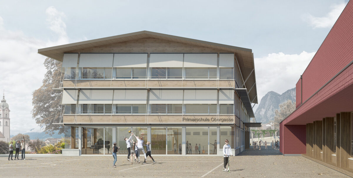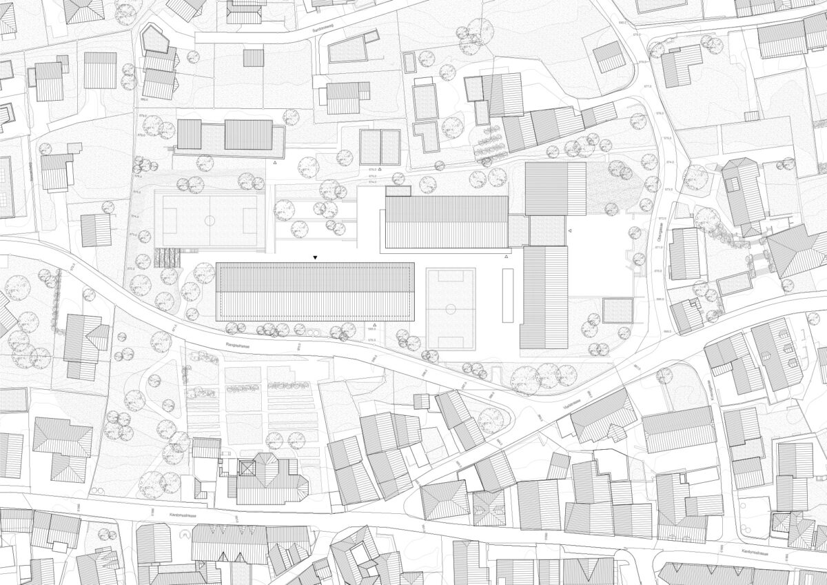 Das neue Schulhausvolumen wird parallel zum Hangverlauf auf dem bestehenden Plateau situiert. Der lineare, dreigeschossige Baukörper ergänzt die bestehende, orthogonale Anlage und schafft mit seiner Setzung klar definierte Freiräume und Aufenthaltsbereiche. Vor dem Lärchensaal wird ein befestigter Platz mit integriertem Allwetterspielfeld gefasst. Nebst der schulischen Nutzung bietet sich dieser Platz auch für Dorf- oder Vereinsfeste an.