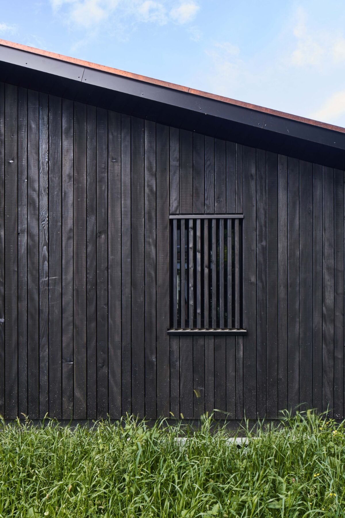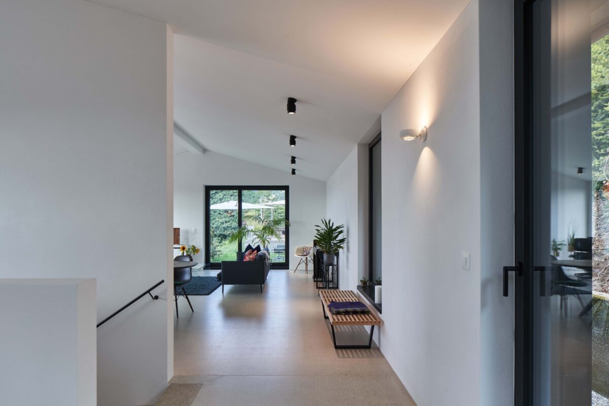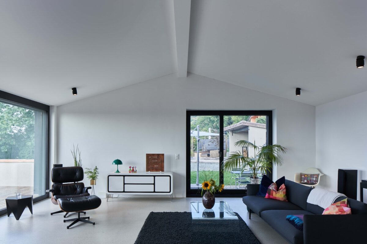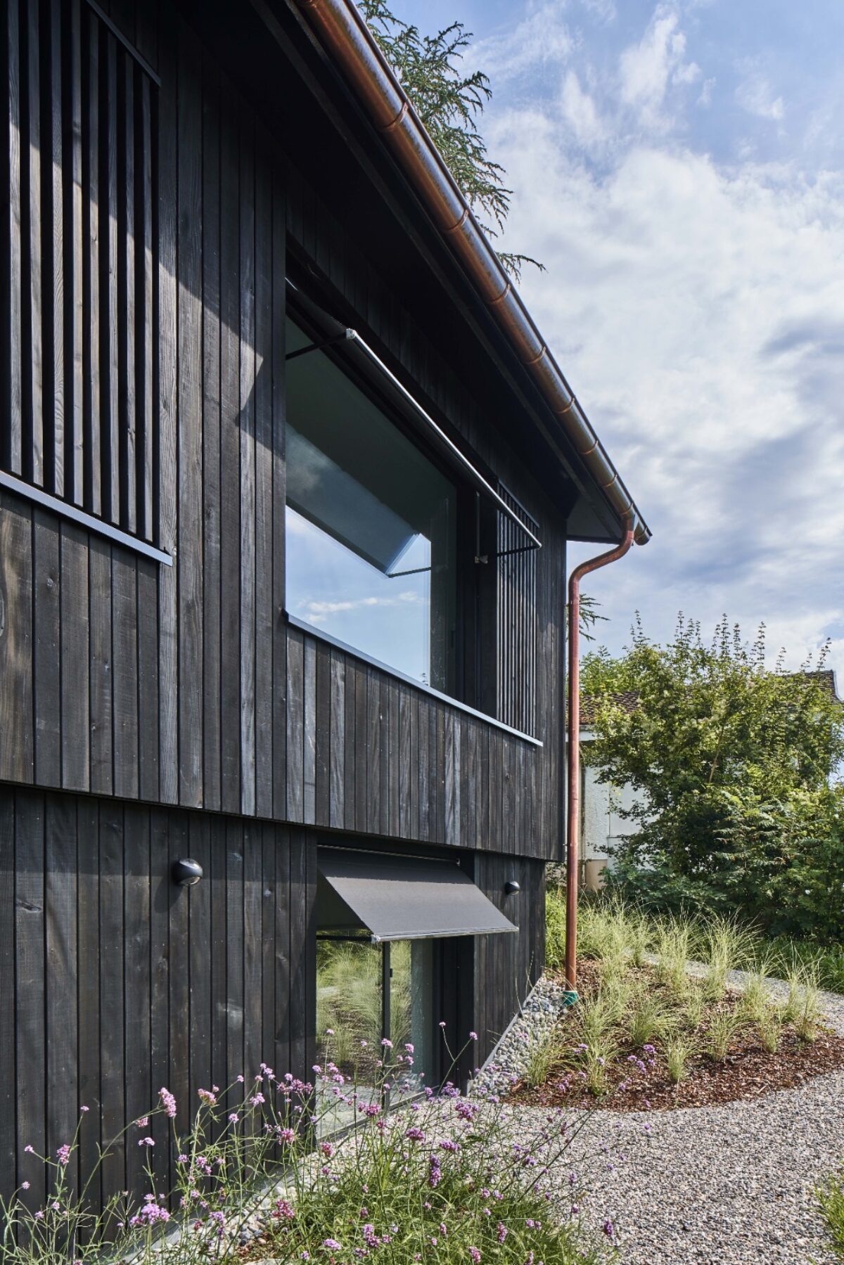 Die Materialisierung stand im Zeichen der Einfachheit. Eine hinterlüftete Holzfassade kombiniert mit Anhydritböden und sandgestrahlten, bestehenden Betondecken runden zusammen mit schwarzen Holzfensterrahmen ein ruhiges, zeitgenössisches Bild ab.