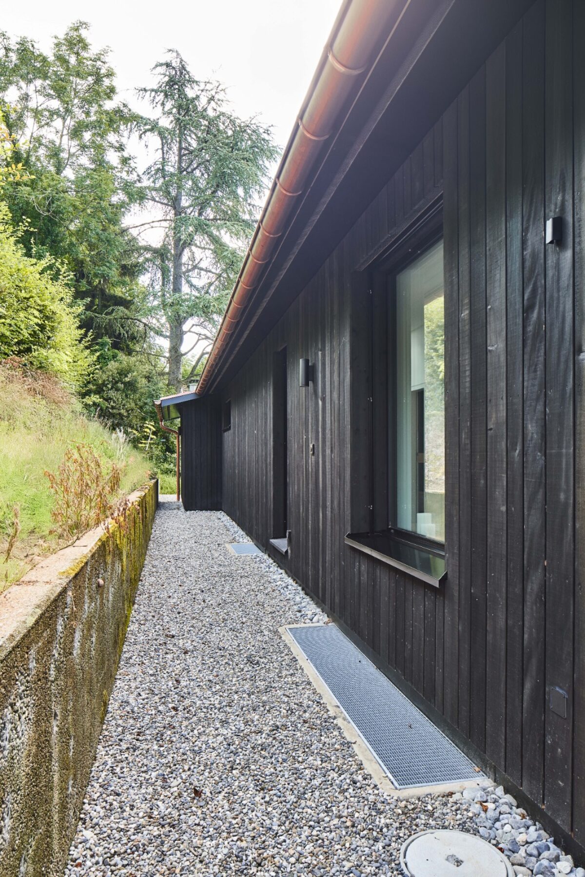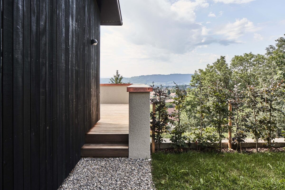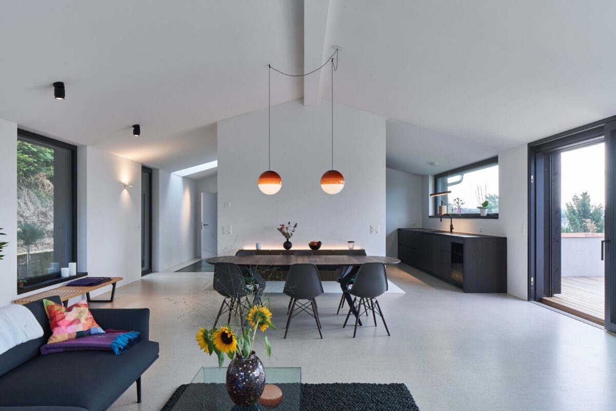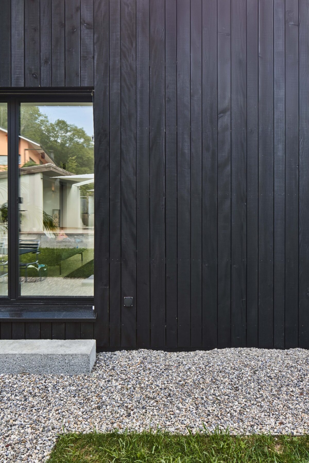 Die Materialisierung stand im Zeichen der Einfachheit. Eine hinterlüftete Holzfassade kombiniert mit Anhydritböden und sandgestrahlten, bestehenden Betondecken runden zusammen mit schwarzen Holzfensterrahmen ein ruhiges, zeitgenössisches Bild ab.