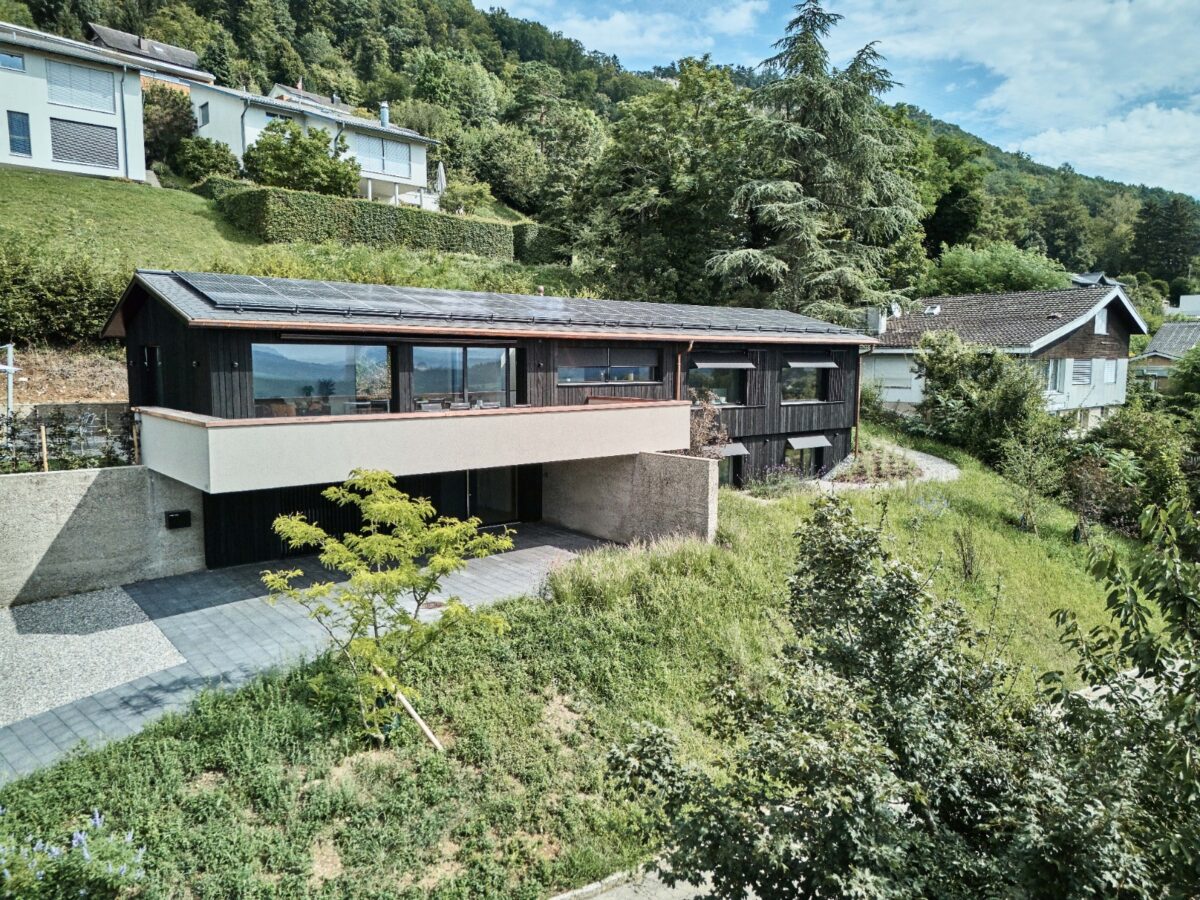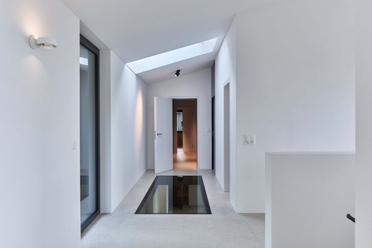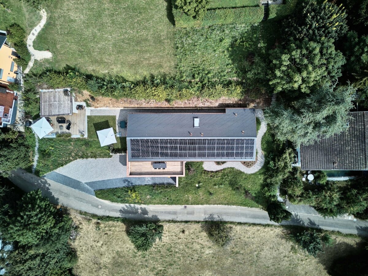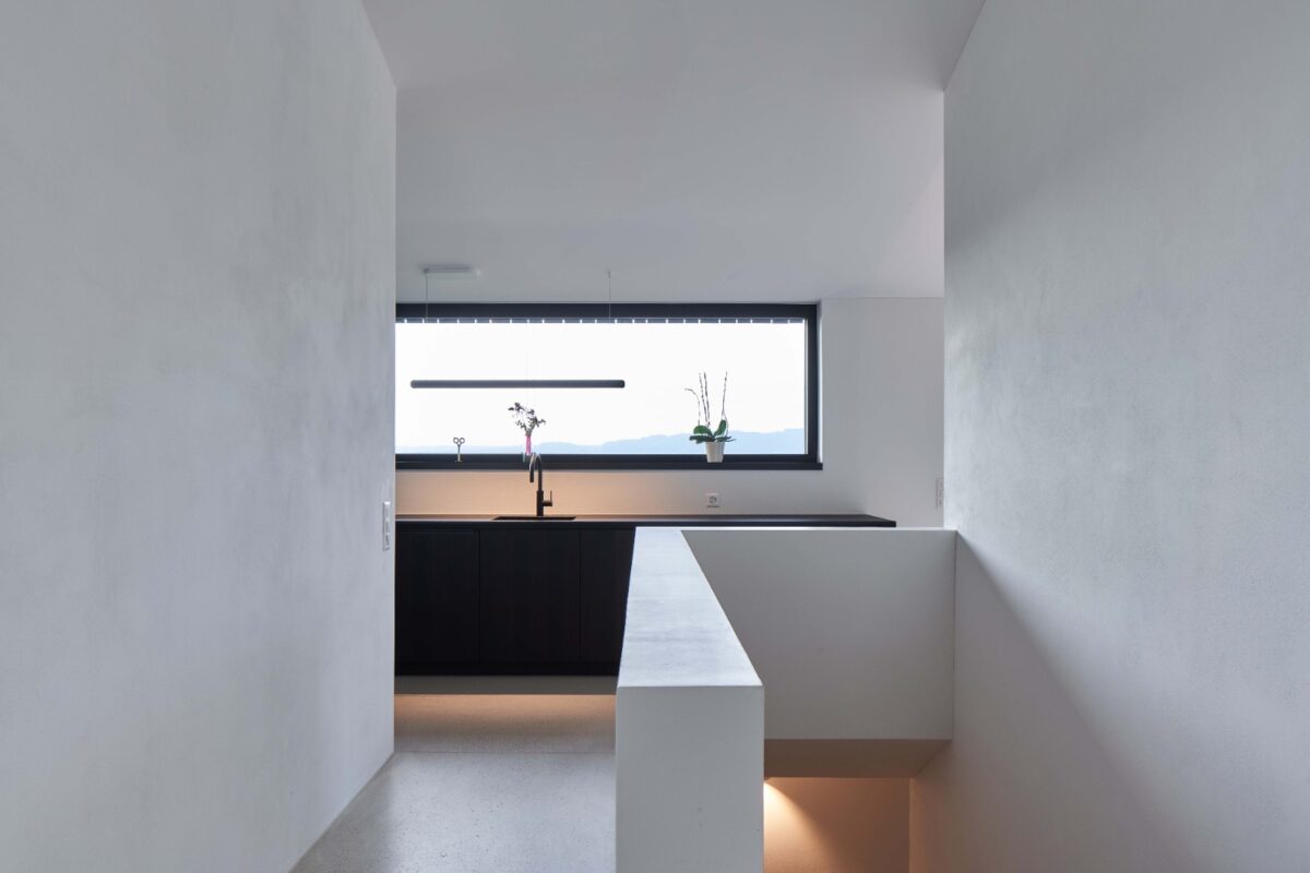 Die Materialisierung stand im Zeichen der Einfachheit. Eine hinterlüftete Holzfassade kombiniert mit Anhydritböden und sandgestrahlten, bestehenden Betondecken runden zusammen mit schwarzen Holzfensterrahmen ein ruhiges, zeitgenössisches Bild ab.