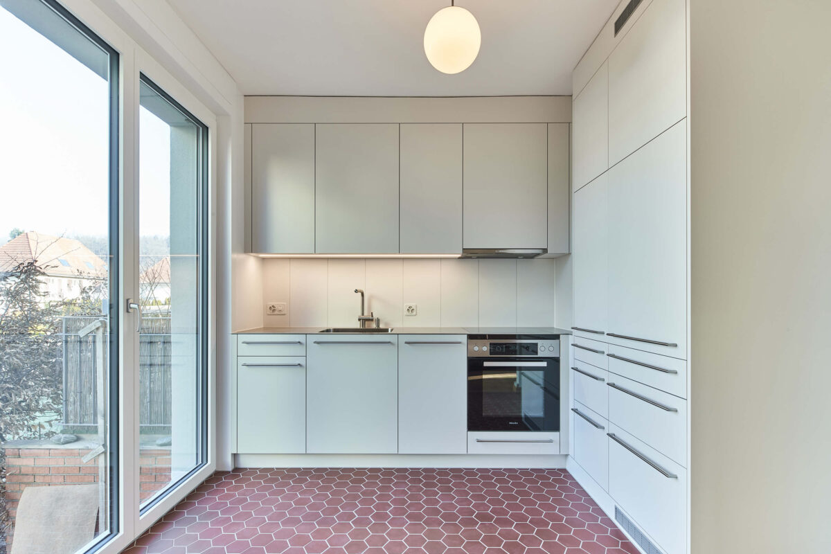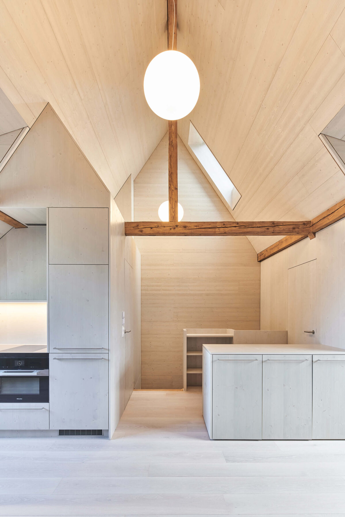 Aufgrund des minimalen Platzbedarf haben wir uns entschieden eine einfache Raumfigur zu konzipieren die über Faltungen sämtlichen notwendigen Räume aufnimmt. Das weiss lasierte Täfer wurde zum Thema gemacht um sämtliche Oberflächen homogen zusammenzubringen und die Raumfigur nochmals zu unterstreichen. Auf der Fläche von ca. 40m2 wird somit eine funktionstüchtige Einliegerwohnung möglich, die sowohl Dusche, Küche, Ankleide und Schlafzimmer aufnimmt.