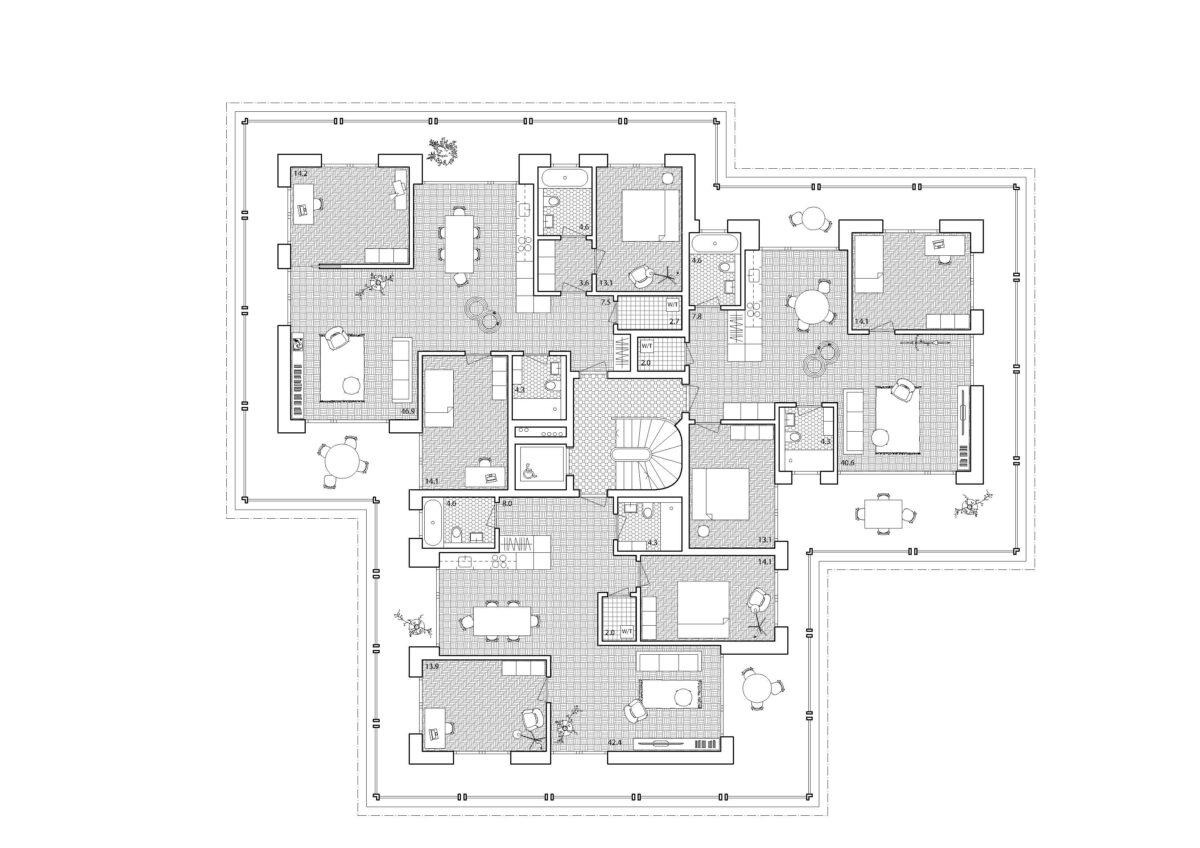 Drei unterschiedlich ausformulierte Gebäudekörper liegen wie Findlingen im Perimeter verteilt. Die orthogonal verschränkten Körper weisen allesamt die gleiche Architektursprache auf, sind jedoch in ihrer Ausrichtung, Zugänglichkeit und Präsenz gedreht, versetzt und spezifisch angeordnet. Was auf den ersten Blick städtebaulich und typologisch eher frei und zufällig zu wirken scheint, erweist sich bei genauer Betrachtung als präzise Reaktion auf die örtlichen Gegebenheiten unter Einbindung der Topografie, der Durchlässigkeit des Aussenraums, einer quartierverträglichen Dichte und einer spannungsvollen Ausrichtung der Gebäudekörper zur Schaffung eines attraktiven Ortes mit eigener Identität und sehr hoher Wohnqualität. Der bestehende, flache Landschaftsraum wird am Ende mit einem markanten Bauensemble strukturiert und findet seinen Übergang in den Siedlungsraum.