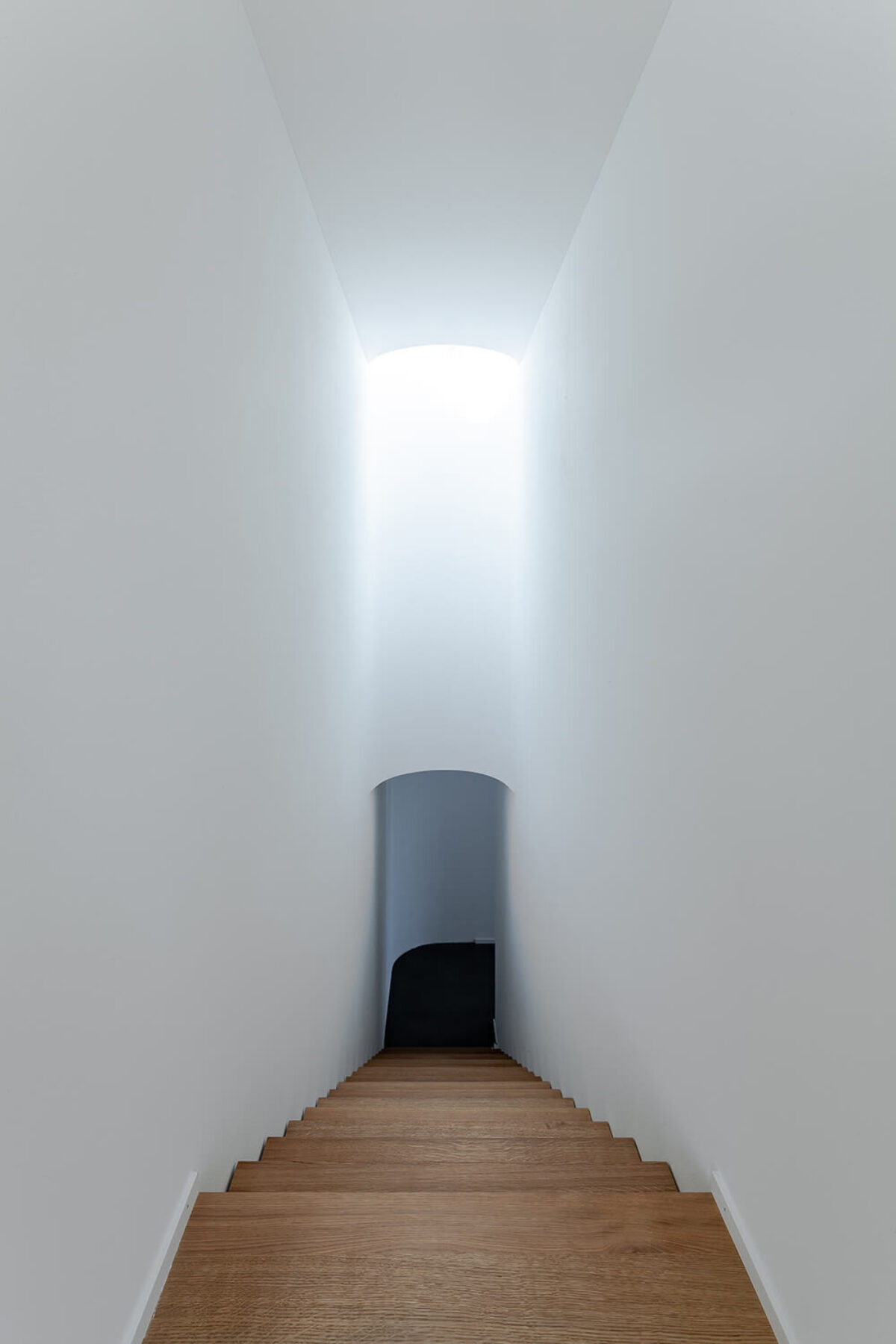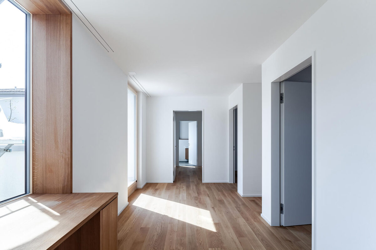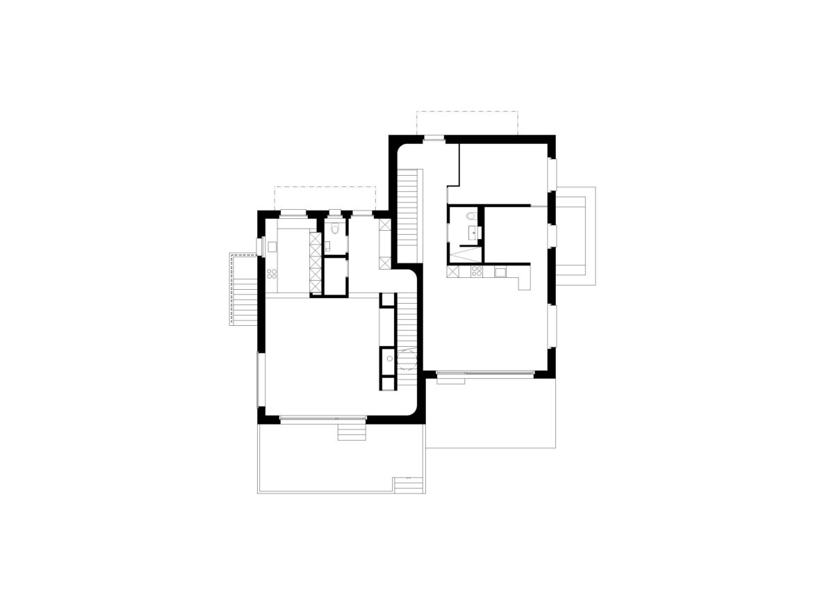 Anstelle des alten, unternutzten Einfamilienhauses auf der keilförmigen, leicht erhöhten Parzelle entsteht ein neues Einfamilienhaus mit einer Einliegerwohnung als Generationenhaus. Entlang der als Rückgrat ausgebildeten Treppe entfaltet sich im Süden die Einliegerwohnung und im Norden die Hauptwohnung. Durch die zusätzliche horizontale Staffelung des Baukörpers wir einerseits der sich verjüngenden Parzelle Rechnung getragen und es entstehen im Westen je zwei private Aussenbereich für die beiden Wohnungen. Die Hauptwohnung überlagert die Einliegerwohnung und bildet im Obergeschoss sowohl im Osten als auch im Westen jeweils eine Terrasse.