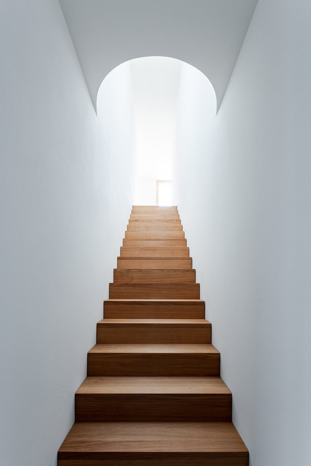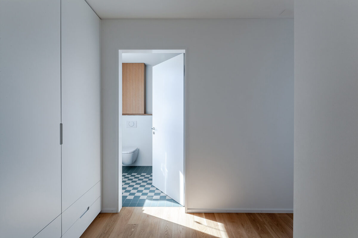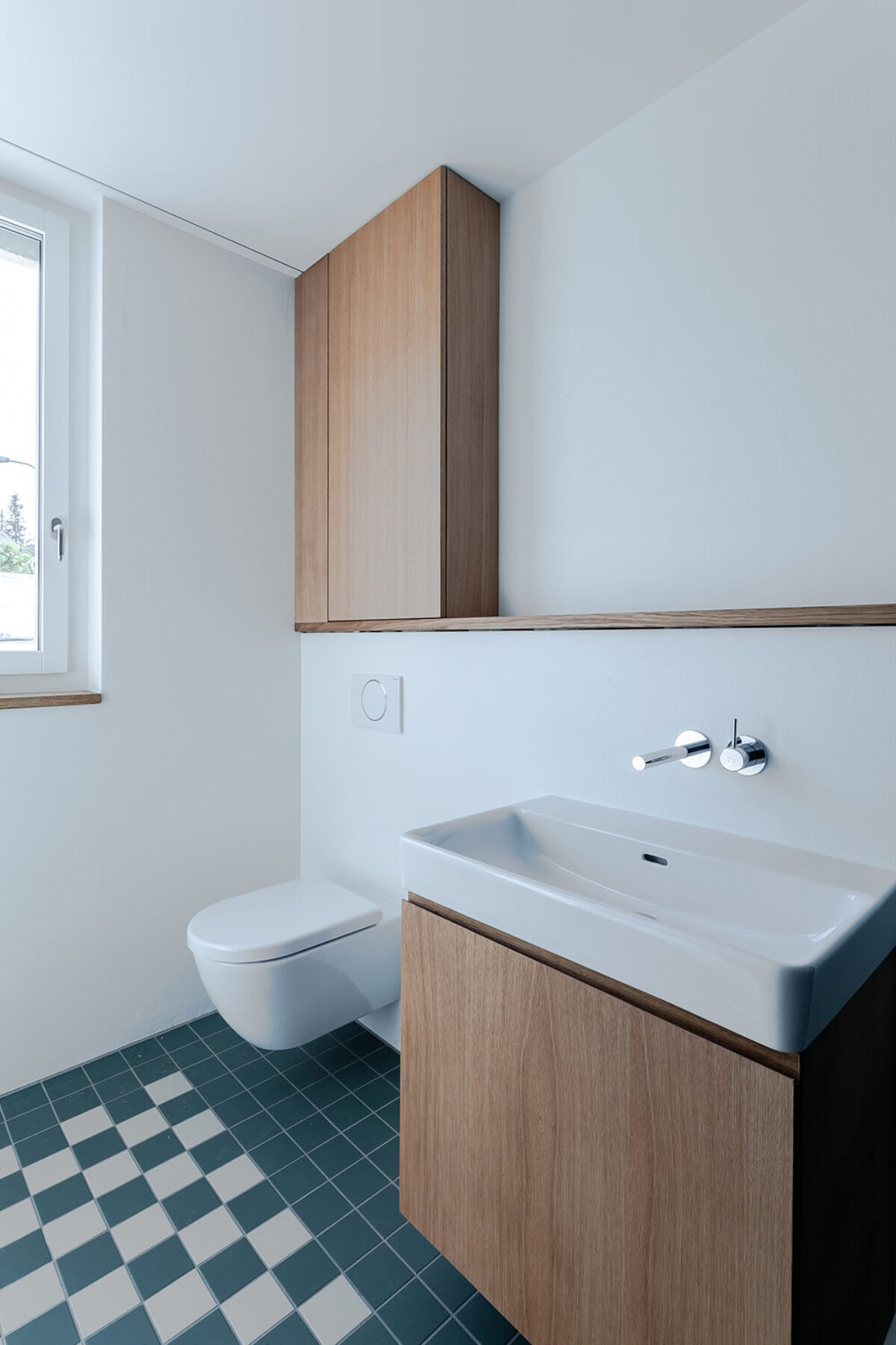 Anstelle des alten, unternutzten Einfamilienhauses auf der keilförmigen, leicht erhöhten Parzelle entsteht ein neues Einfamilienhaus mit einer Einliegerwohnung als Generationenhaus. Entlang der als Rückgrat ausgebildeten Treppe entfaltet sich im Süden die Einliegerwohnung und im Norden die Hauptwohnung. Durch die zusätzliche horizontale Staffelung des Baukörpers wir einerseits der sich verjüngenden Parzelle Rechnung getragen und es entstehen im Westen je zwei private Aussenbereich für die beiden Wohnungen. Die Hauptwohnung überlagert die Einliegerwohnung und bildet im Obergeschoss sowohl im Osten als auch im Westen jeweils eine Terrasse.