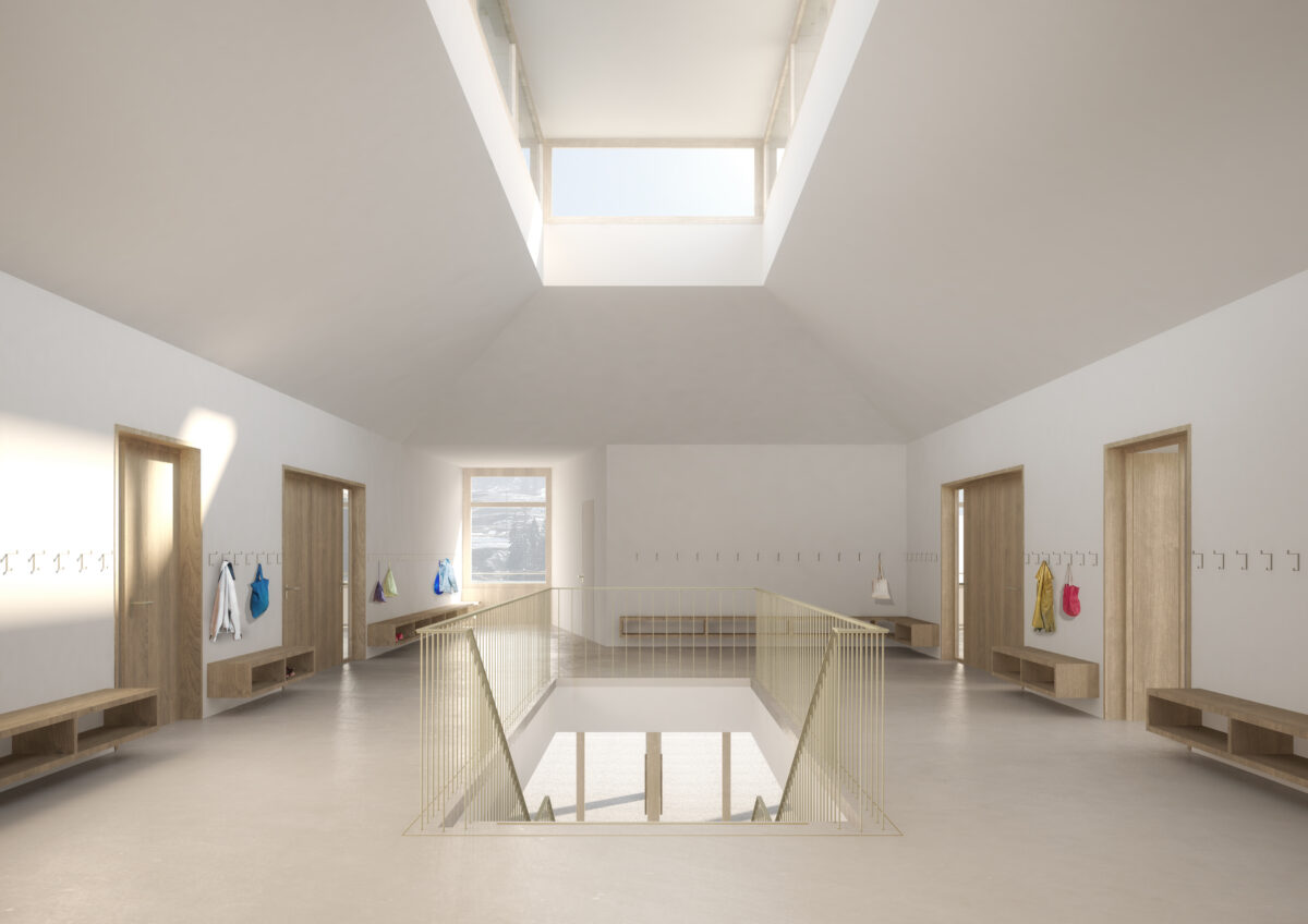 Das bestehende Mehrzweckgebäude, welches nach dem Rückbau des Schulhauses als freistehender Kubus wirkt, wird neu durch ein Primarschulhausvolumen in der östlichen und einen Kindergartenpavillon in der südlichen Parzellenecke ergänzt.