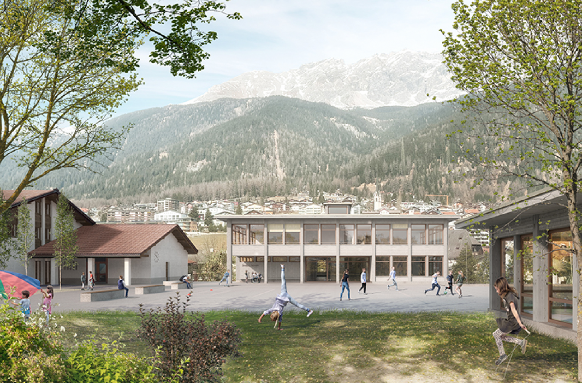 Das Primarschulhaus setzt mit seiner Dreigeschossigkeit zur Kreuzung Veia Grava/ Veia Davos- Tga Clo im Osten einen klaren städtebaulichen Akzent und hilft dabei, diesen Platzraum städtebaulich klar zu definieren. Die Volumina von Primarschule und Kindergarten spannen zusammen mit dem Mehrzweckgebäude auf der oberen Ebene einen klar definierten, maximal grossen, geschützten und optimal besonnten Freiraum für die Schulanlage auf. Dieser Platz bietet durch seine Gestaltung differenzierte Aussen- und Aufenthaltsräume, die durch die Schüler oder auch durch die Öffentlichkeit unterschiedlich bespielbar sind.